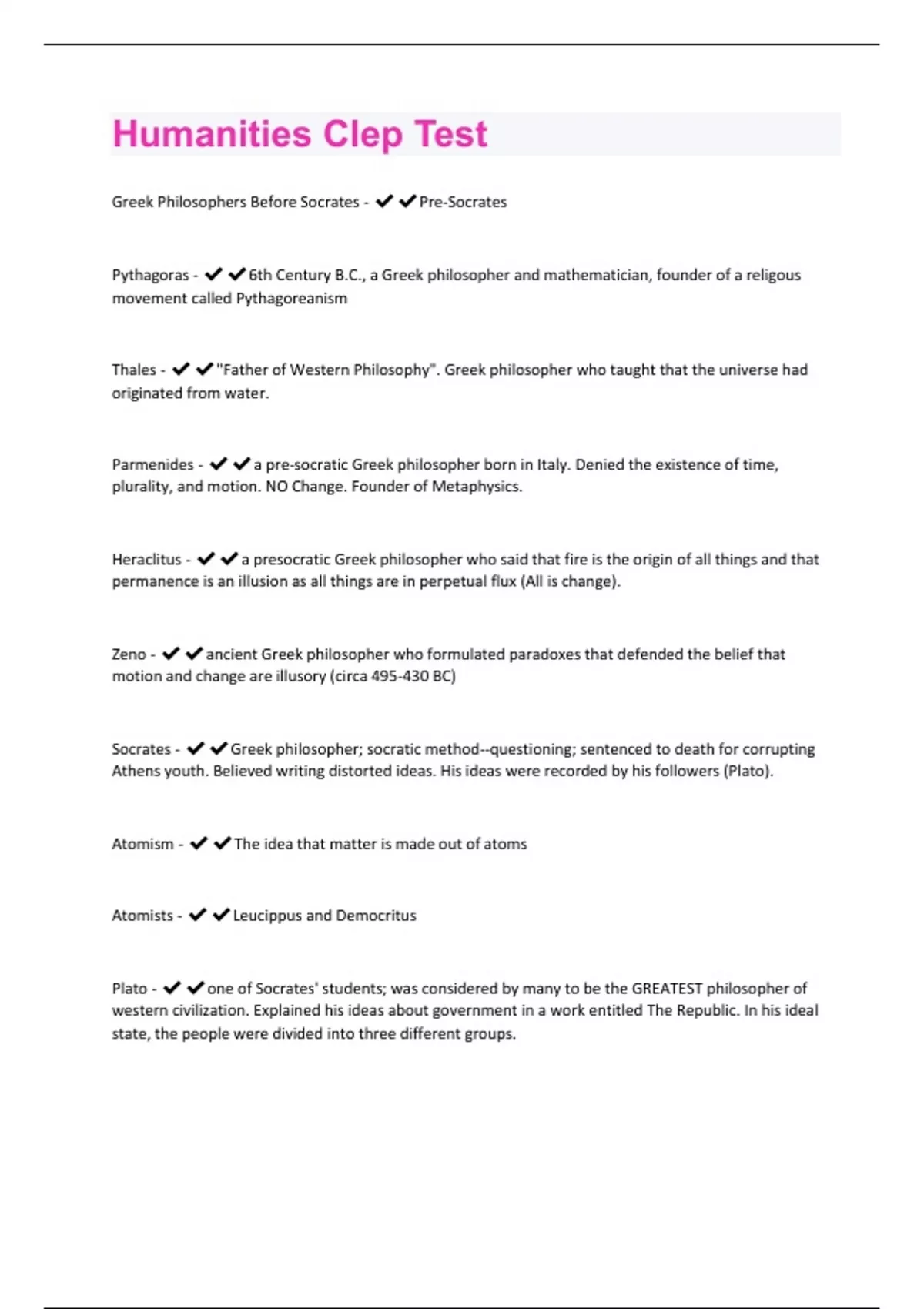 Greek Philosophers Before Socrates - Pre-Socrates Pythagoras - 6th Century B.C., a Greek philosopher and mathematician, founder of a religous movement called Pythagoreanism Thales - "Father of Western Philosophy". Greek philosopher who taught that the universe had originated from water. Parmenides - a pre-socratic Greek philosopher born in Italy. Denied the existence of time, plurality, and motion. NO Change. Founder of Metaphysics. Heraclitus - a presocratic Greek philosopher who said that fire is the origin of all things and that permanence is an illusion as all things are in perpetual flux (All is change). Zeno - ancient Greek philosopher who formulated paradoxes that defended the belief that motion and change are illusory (circa 495-430 BC) Socrates - Greek philosopher; socratic method--questioning; sentenced to death for corrupting Athens youth. Believed writing distorted ideas. His ideas were recorded by his followers (Plato). Atomism - The idea that matter is made out of atoms Atomists - Leucippus and Democritus Plato - one of Socrates' students; was considered by many to be the GREATEST philosopher of western civilization. Explained his ideas about government in a work entitled The Republic. In his ideal state, the people were divided into three different groups.Aristotle - Greek philosopher. A pupil of Plato, the tutor of Alexander the Great, and the author of works on logic, metaphysics, ethics, natural sciences, politics, and poetics, he profoundly influenced Western thought. In his philosophical system, which led him to criticize what he saw as Plato's metaphysical excesses, theory follows empirical observation and logic, based on the syllogism, is the essential method of rational inquiry.