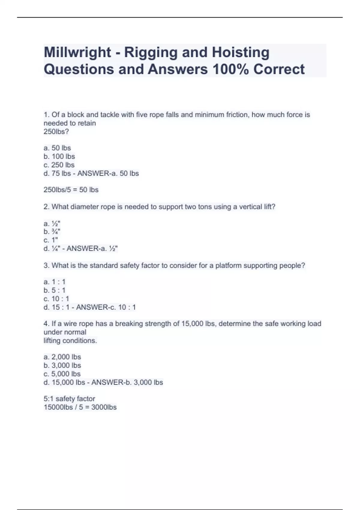 Millwright - Rigging and Hoisting Questions and Answers 100% CorrectMillwright - Rigging and Hoisting Questions and Answers 100% CorrectMillwright - Rigging and Hoisting Questions and Answers 100% CorrectMillwright - Rigging and Hoisting Questions and Answers 100% Correct1. Of a block and tackle with five rope falls and minimum friction, how much force is needed to retain 250lbs? a. 50 lbs b. 100 lbs c. 250 lbs d. 75 lbs - ANSWER-a. 50 lbs 250lbs/5 = 50 lbs 2. What diameter rope is needed to support two tons using a vertical lift? a. ½" b. ¾" c. 1" d. ¼" - ANSWER-a. ½" 3. What is the standard safety factor to consider for a platform supporting people? a. 1 : 1 b. 5 : 1 c. 10 : 1 d. 15 : 1 - ANSWER-c. 10 : 1 4. If a wire rope has a breaking strength of 15,000 lbs, determine the safe working load under normal lifting conditions. a. 2,000 lbs b. 3,000 lbs c. 5,000 lbs d. 15,000 lbs - ANSWER-b. 3,000 lbs 5:1 safety factor 15000lbs / 5 = 3000lbs
