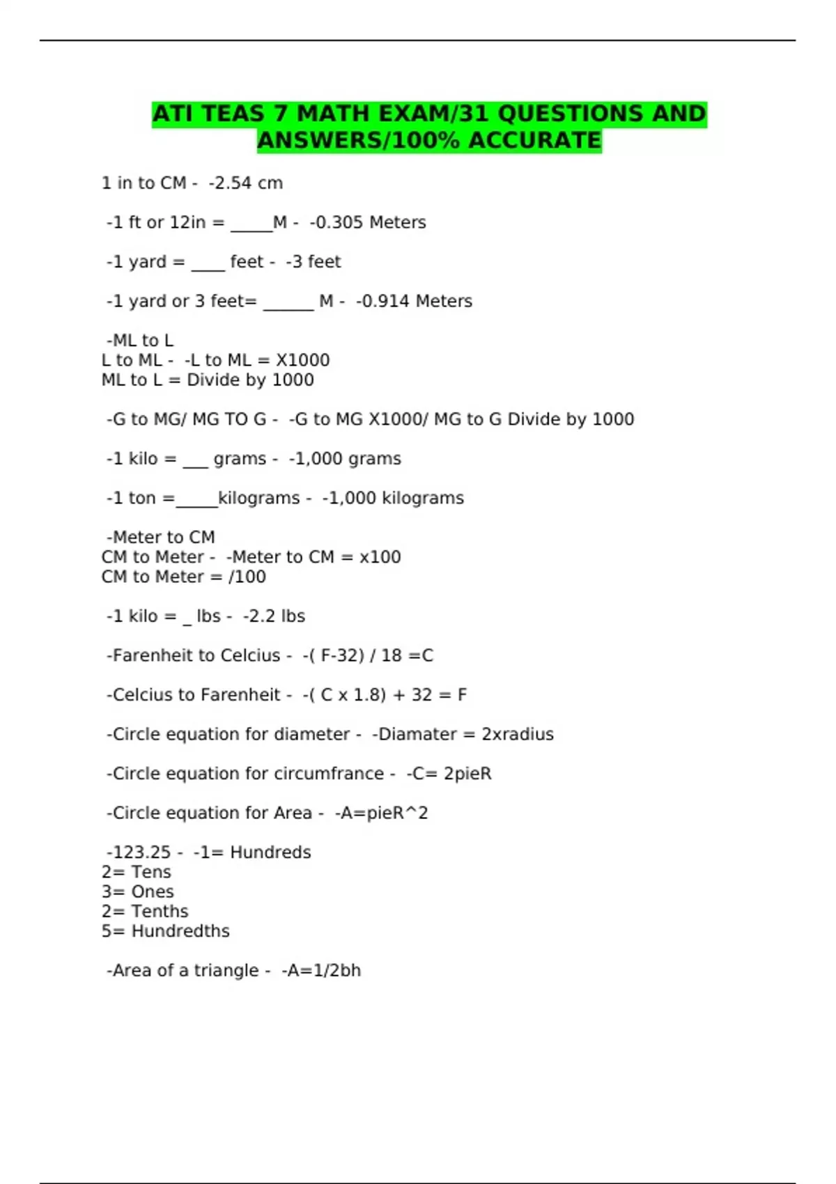 ATI TEAS 7 MATH EXAM/31 QUESTIONS AND