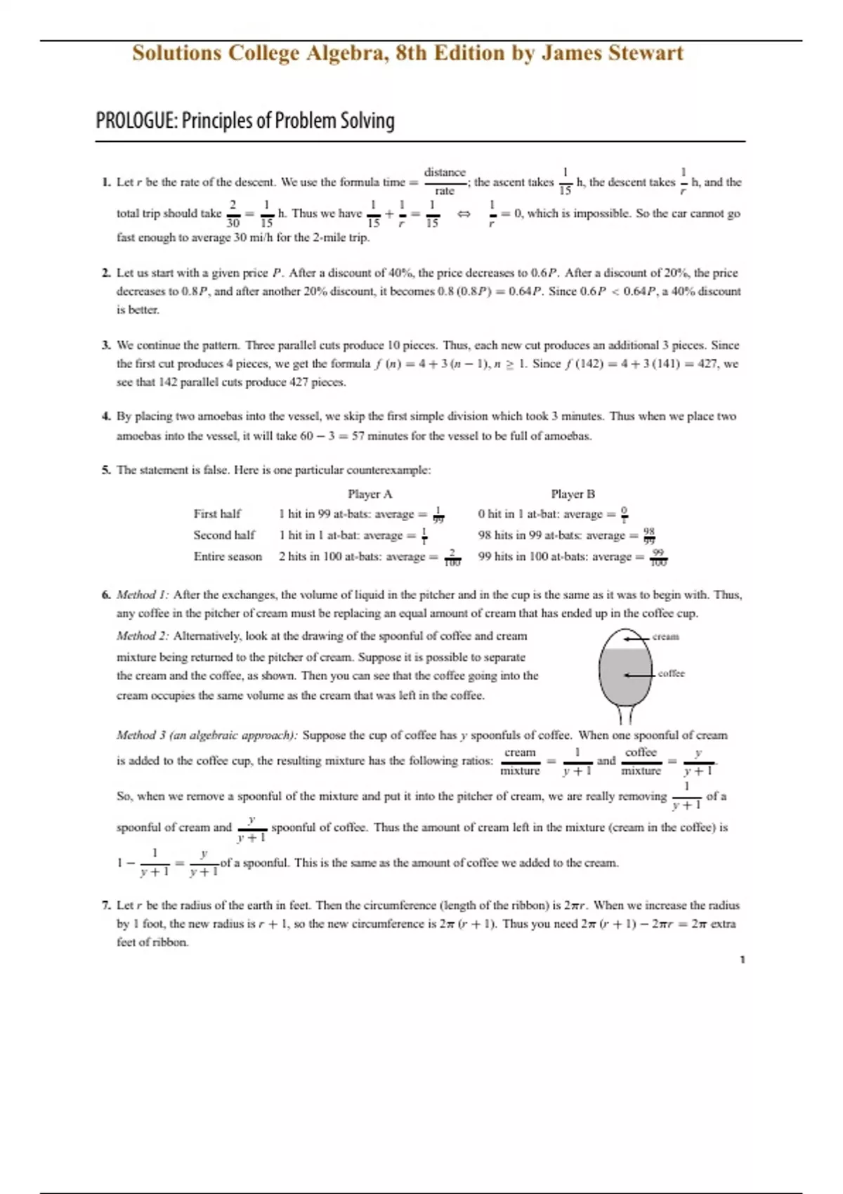 Complete Solutions Manual for College Algebra, 8th Edition 8e by James Stewart, Lothar Redlin, Saleem Watson. Full Chapters Solutions are included - Chapter 1 to 9 P. PREREQUISITES. Chapter Overview P.1 Modeling the Real-World with Algebra. P.2 The Real Numbers. P.3 Integer Exponents and Scientific Notation. P.4 Rational Exponents and Radicals. P.5 Algebraic Expressions. P.6 Factoring. P.7 Rational Expressions. P.8 Solving Basic Equations. P.9 Modeling with Equations. Chapter P Review. Chapter P Test. FOCUS ON MODELING: Making the Best Decisions. 1. EQUATIONS AND GRAPHS. 1.1 The Coordinate Plane. 1.2 Graphs of Equations in Two Variables; Circles. 1.3 Lines. 1.4 Solving Quadratic Equations. 1.5 Complex Numbers. 1.6 Solving Other Types of Equations. 1.7 Solving Inequalities. 1.8 Solving Absolute Value Equations and Inequalities. 1.9 Solving Equations and Inequalities Graphically. 1.10 Modeling Variations. Chapter 1 Review. Chapter 1 Test. FOCUS ON MODELING: Fitting Lines to Data. 2. FUNCTIONS. Chapter Overview. 2.1 Functions. 2.2 Graphs of Functions. 2.3 Getting Information from the Graph of a Function. 2.4 Average Rate of Change of a Function. 2.5 Linear Functions and Models. 2.6 Transformations of Functions. 2.7 Combining Functions. 2.8 One-to-One Functions and Their Inverses. Chapter 2 Review. Chapter 2 Test. FOCUS ON MODELING: Modeling with Functions. 3. POLYNOMIAL AND RATIONAL FUNCTIONS. Chapter Overview. 3.1 Quadratic Functions and Models. 3.2 Polynomial Functions and Their Graphs. 3.3 Dividing Polynomials. 3.4 Real Zeros of Polynomials. 3.5 Complex Zeros and the Fundamental Theorem of Algebra. 3.6 Rational Functions. 3.7 Polynomial and Rational Inequalities. Chapter 3 Review. Chapter 3 Test. FOCUS ON MODELING: Fitting Polynomial Curves to Data. 4. EXPONENTIAL AND LOGARITHMIC FUNCTIONS. Chapter Overview. 4.1 Exponential Functions. 4.2 The Natural Exponential Function. 4.3 Logarithmic Functions. 4.4 Laws of Logarithms. 4.5 Exponential and Logarithmic Equations. 4.6 Modeling with Exponential Functions. 4.7 Logarithmic Scales. Chapter 4 Review. Chapter 4 Test. FOCUS ON MODELING: Fitting Exponential and Power Curves to Data. 5. SYSTEMS OF EQUATIONS AND INEQUALITIES. Chapter Overview. 5.1 Systems of Linear Equations in Two Variables. 5.2 Systems of Linear Equations in Several Variables. 5.3 Partial Fractions. 5.4 Systems of Nonlinear Equations. 5.5 Systems of Inequalities. Chapter 5 Review. Chapter 5 Test. FOCUS ON MODELING: Linear Programming. 6. MATRICES AND DETERMINANTS. Chapter Overview. 6.1 Matrices and Systems of Linear Equations. 6.2 The Algebra of Matrices. 6.3 Inverses of Matrices and Matrix Equations. 6.4 Determinants and Cramer's Rule. Chapter 6 Review. Chapter 6 Test. FOCUS ON MODELING: Computer Graphics. 7. CONIC SECTIONS. Chapter Overview. 7.1 Parabolas. 7.2 Ellipses. 7.3 Hyperbolas. 7.4 Shifted Conics. Chapter 7 Review. Chapter 7 Test. FOCUS ON MODELING: Conics in Architecture. 8. SEQUENCES AND SERIES. Chapter Overview. 8.1 Sequences and Summation Notation. 8.2 Arithmetic Sequences. 8.3 Geometric Sequences. 8.4 Mathematical Induction. 8.5 The Binomial Theorem. Chapter 8 Review. Chapter 8 Test. FOCUS ON MODELING: Modeling with Recursive Sequences. 9. COUNTING AND PROBABILITY. Chapter Overview. 9.1 Counting. 9.2 Probability. 9.3 Binomial Probability. 9.4 Expected Value. Chapter 9 Review. Chapter 9 Test.