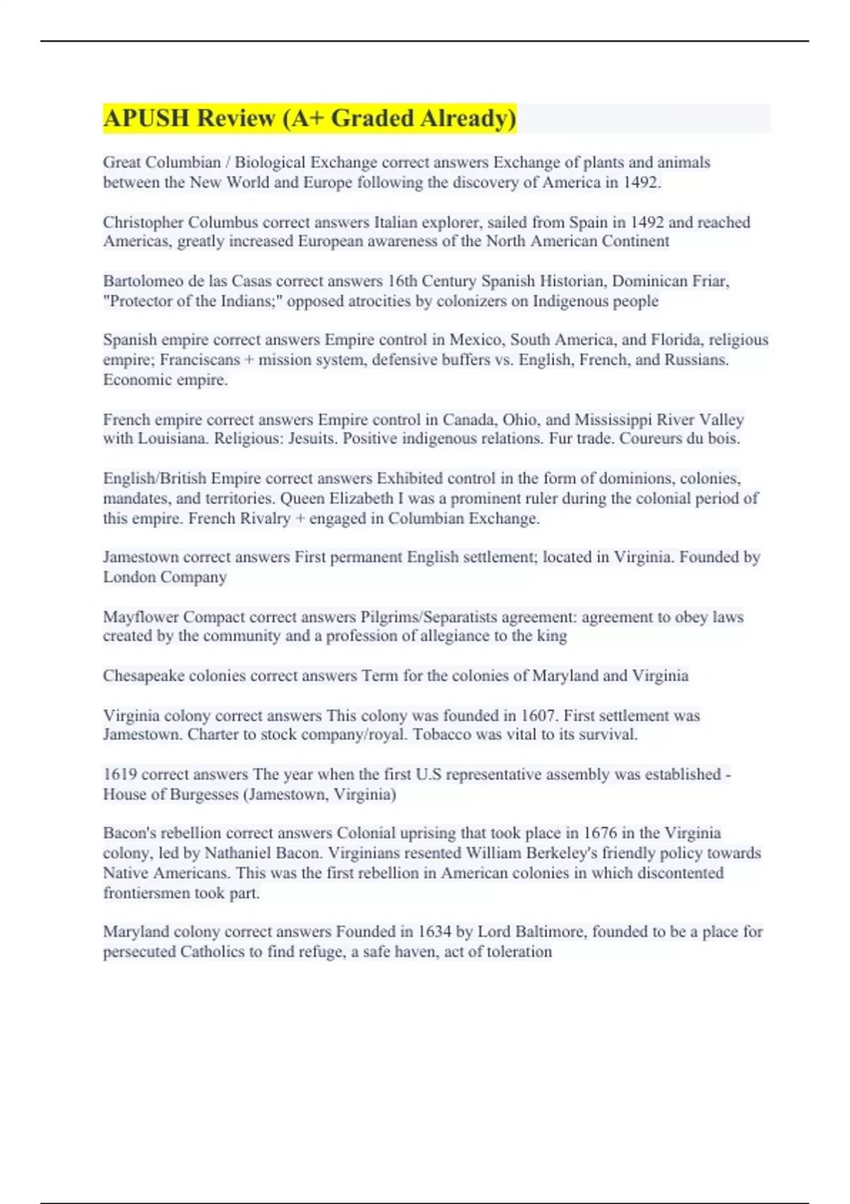 Great Columbian / Biological Exchange correct answers Exchange of plants and animals between the New World and Europe following the discovery of America in 1492. Christopher Columbus correct answers Italian explorer, sailed from Spain in 1492 and reached Americas, greatly increased European awareness of the North American Continent Bartolomeo de las Casas correct answers 16th Century Spanish Historian, Dominican Friar, "Protector of the Indians;" opposed atrocities by colonizers on Indigenous people Spanish empire correct answers Empire control in Mexico, South America, and Florida, religious empire; Franciscans + mission system, defensive buffers vs. English, French, and Russians. Economic empire. French empire correct answers Empire control in Canada, Ohio, and Mississippi River Valley with Louisiana. Religious: Jesuits. Positive indigenous relations. Fur trade. Coureurs du bois. English/British Empire correct answers Exhibited control in the form of dominions, colonies, mandates, and territories. Queen Elizabeth I was a prominent ruler during the colonial period of this empire. French Rivalry + engaged in Columbian Exchange. Jamestown correct answers First permanent English settlement; located in Virginia. Founded by London Company Mayflower Compact correct answers Pilgrims/Separatists agreement: agreement to obey laws created by the community and a profession of allegiance to the king Chesapeake colonies correct answers Term for the colonies of Maryland and Virginia Virginia colony correct answers This colony was founded in 1607. First settlement was Jamestown. Charter to stock company/royal. Tobacco was vital to its survival. 1619 correct answers The year when the first U.S representative assembly was established - House of Burgesses (Jamestown, Virginia) Bacon's rebellion correct answers Colonial uprising that took place in 1676 in the Virginia colony, led by Nathaniel Bacon. Virginians resented William Berkeley's friendly policy towards Native Americans. This was the first rebellion in American colonies in which discontented frontiersmen took part. Maryland colony correct answers Founded in 1634 by Lord Baltimore, founded to be a place for persecuted Catholics to find refuge, a safe haven, act of toleration
