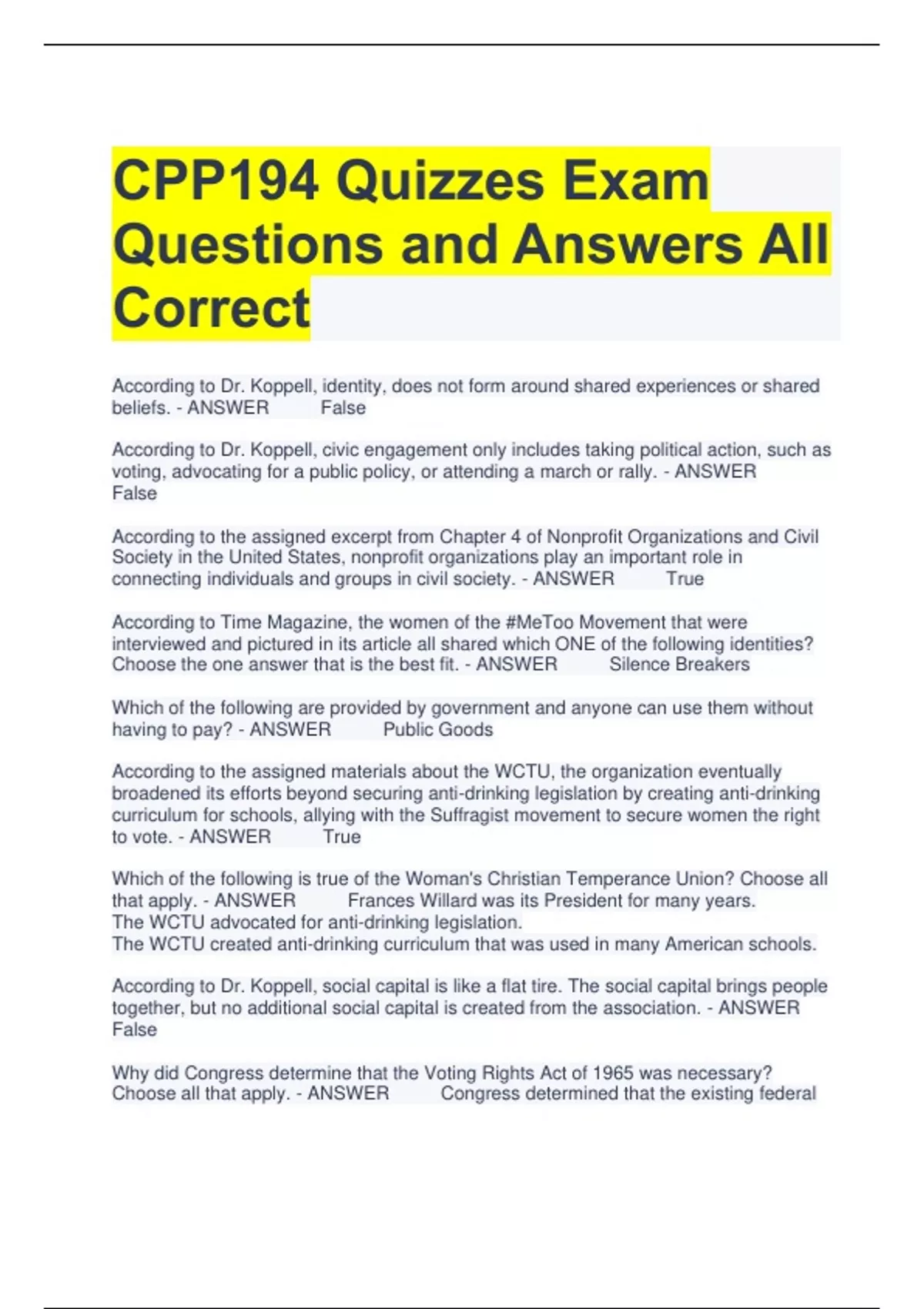 CPP194 Quizzes Exam Questions and Answers All Correct According to Dr. Koppell, identity, does not form around shared experiences or shared beliefs. - ANSWER False According to Dr. Koppell, civic engagement only includes taking political action, such as voting, advocating for a public policy, or attending a march or rally. - ANSWER False According to the assigned excerpt from Chapter 4 of Nonprofit Organizations and Civil Society in the United States, nonprofit organizations play an important role in connecting individuals and groups in civil society. - ANSWER True According to Time Magazine, the women of the #MeToo Movement that were interviewed and pictured in its article all shared which ONE of the following identities? Choose the one answer that is the best fit. - ANSWER Silence Breakers Which of the following are provided by government and anyone can use them without having to pay? - ANSWER Public Goods According to the assigned materials about the WCTU, the organization eventually broadened its efforts beyond securing anti-drinking legislation by creating anti-drinking curriculum for schools, allying with the Suffragist movement to secure women the right to vote. - ANSWER True Which of the following is true of the Woman's Christian Temperance Union? Choose all that apply. - ANSWER Frances Willard was its President for many years. The WCTU advocated for anti-drinking legislation. The WCTU created anti-drinking curriculum that was used in many American schools. According to Dr. Koppell, social capital is like a flat tire. The social capital brings people together, but no additional social capital is created from the association. - ANSWER False Why did Congress determine that the Voting Rights Act of 1965 was necessary? Choose all that apply. - ANSWER Congress determined that the existing federal anti-discrimination laws were not sufficient to overcome the resistance by state officials to enforcement of the 15th Amendment. The legislative hearings showed that the Department of Justice's efforts to eliminate discriminatory election practices by litigation on a case-by-case basis had been unsuccessful in opening up the registration process As soon as one discriminatory practice or procedure was proven to be unconstitutional and enjoined, a new one would be substituted in its place and litigation would have to commence anew.