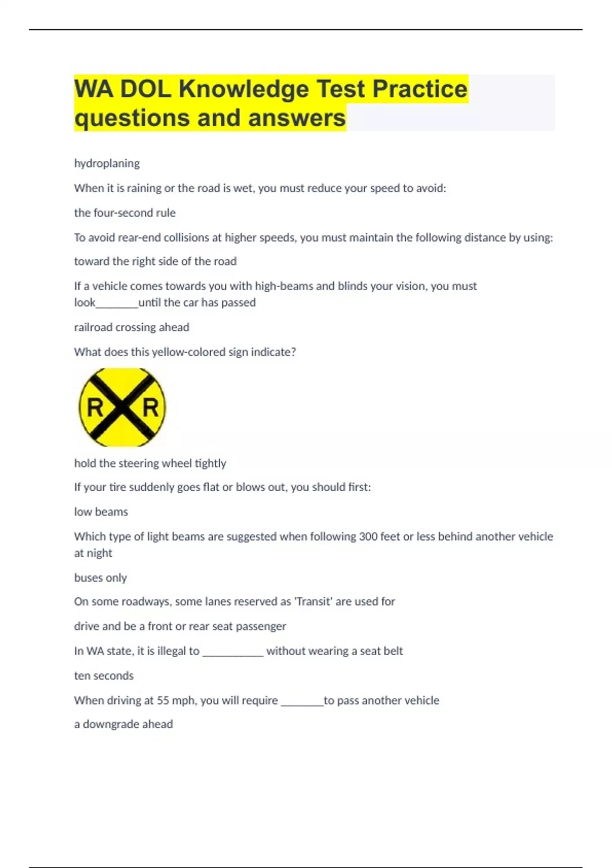 hydroplaning When it is raining or the road is wet, you must reduce your speed to avoid: the four-second rule To avoid rear-end collisions at higher speeds, you must maintain the following distance by using: toward the right side of the road If a vehicle comes towards you with high-beams and blinds your vision, you must look_______until the car has passed railroad crossing ahead What does this yellow-colored sign indicate? hold the steering wheel tightly If your tire suddenly goes flat or blows out, you should first: low beams Which type of light beams are suggested when following 300 feet or less behind another vehicle at night buses only On some roadways, some lanes reserved as 'Transit' are used for drive and be a front or rear seat passenger In WA state, it is illegal to __________ without wearing a seat belt ten seconds When driving at 55 mph, you will require _______to pass another vehicle a downgrade ahead This sign warns of away from the curb When you park your vehicle next to a curb facing uphill, set your parking brake and turn your steering wheel: 0.08 In WA state, if you are 21 or above, you can be arrested for driving with a blood alcohol content (BAC) of stop sign A flashing red traffic light should be considered as a: come to a complete stop When you see a stopped school bus with flashing red lights in your driving lane, you must: a stop sign ahead This diamond shaped sign with an arrow mark and a picture of an octagonal sign below warns of: left hand between 8 and 9 o'clock and right hand between 3 and 4 o'clock An ideal hand position for holding the steering wheel during driving is: stop your vehicle If you see a pedestrian using a guide dog or other eservice animal or carrying a white cane at an intersection, you must a divided highway starts ahead This arrow-marked sign indicates that 12 inches The legal maximum distance within which you may park your vehicle parallel to the curb is crossroad ahead; drivers must be alert What does this sign mean? 500 feet You must not follow emergency vehicles closer than stay in your lane If you see a solid white line between lanes of traffic, you must