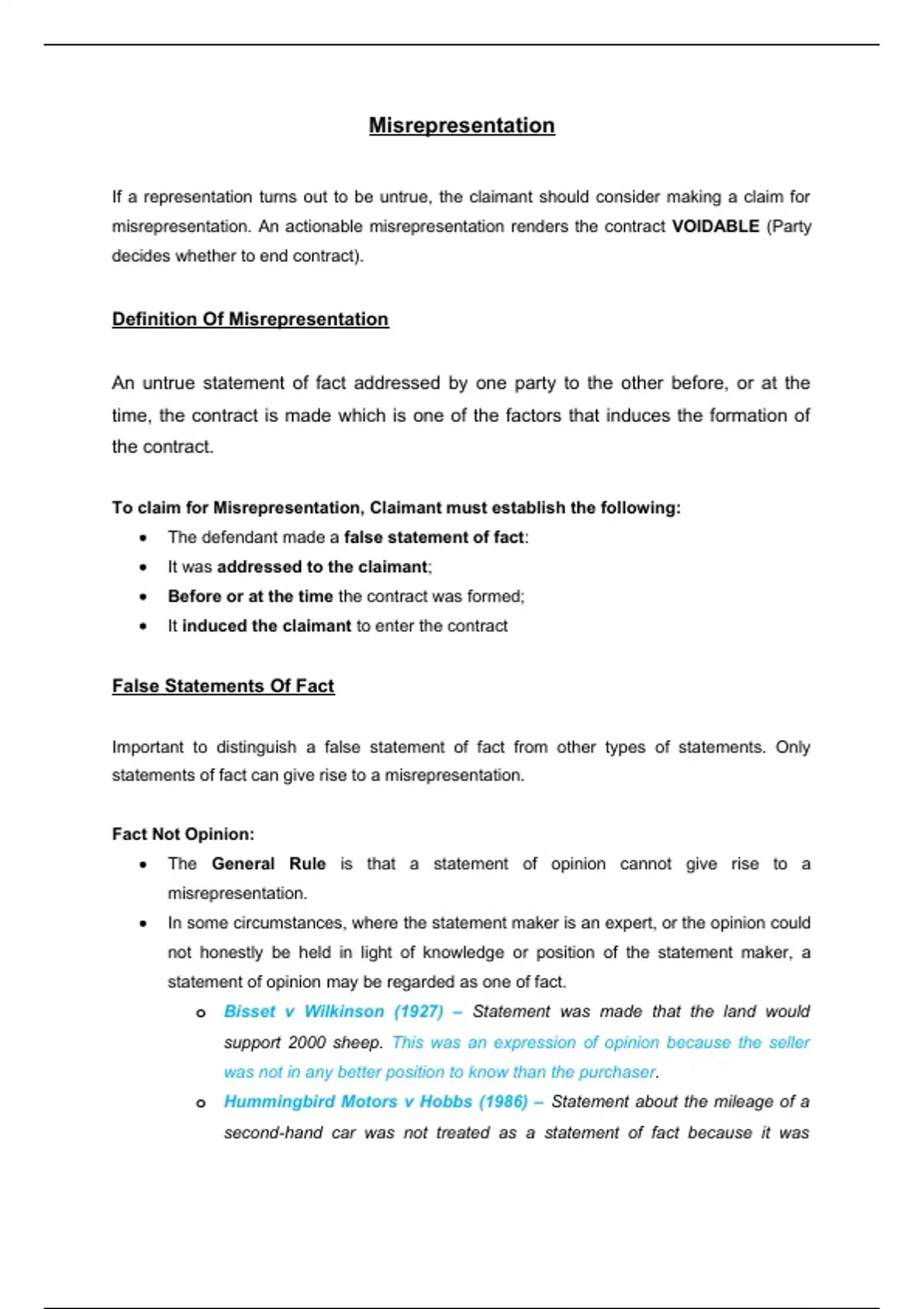 misrepresentation. An actionable misrepresentation renders the contract VOIDABLE (Party
