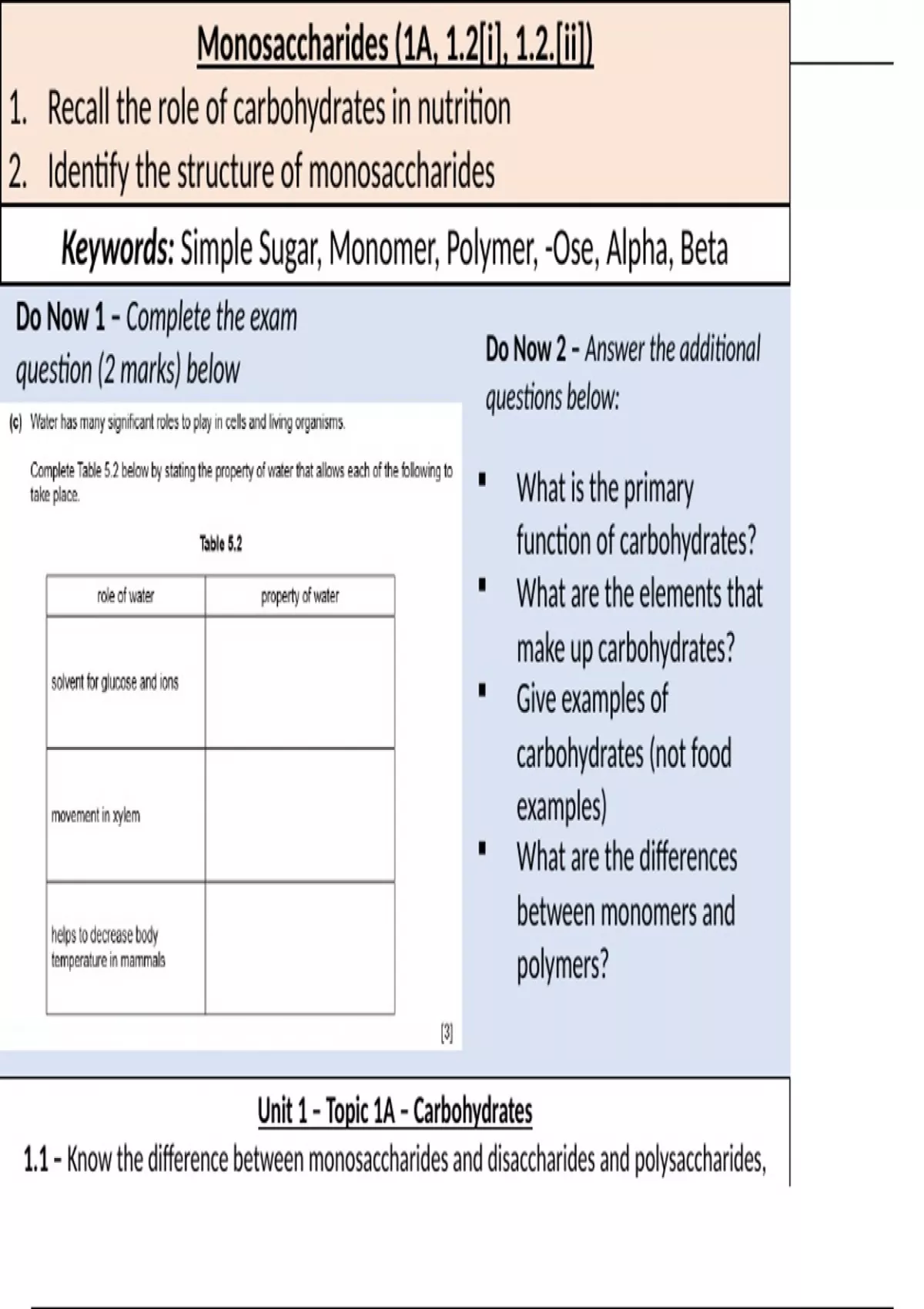 Monosaccharides (1A, 1.2[i], 1.2.[ii])
