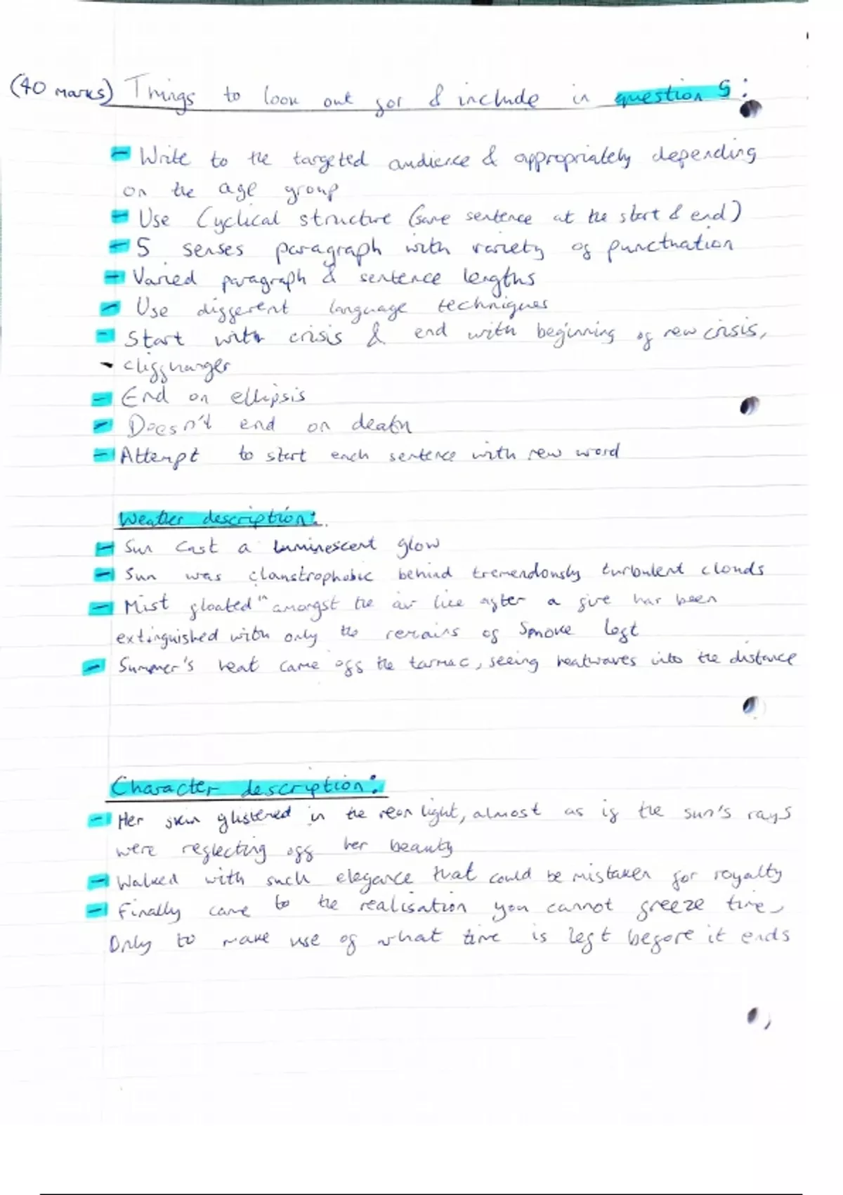 Summary English Language Paper 1 - Everything You Need to Include for Every Question to Achieve a GRADE 9 - Includes Examples of Weather and Character Descriptions