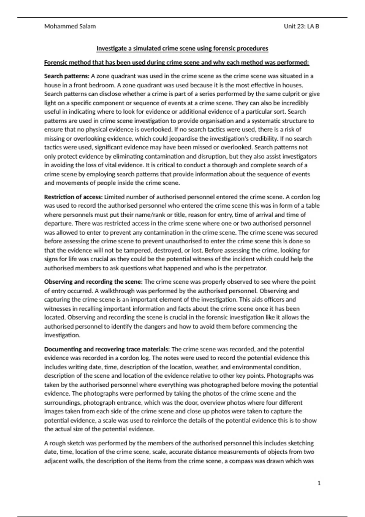 This assignment has achieved Distinction grade and contains all of the necessary contents such as forensic method that has been used during crime scene and why each method was performed like what search patterns was used in the crime scene practical, types of packaging used to maintain the continuity of evidence and labelling the evidence and wearing the appropriate PPE before entering the crime scene, this assignment may not be the standards for other schools as different may require different criteria requirements.