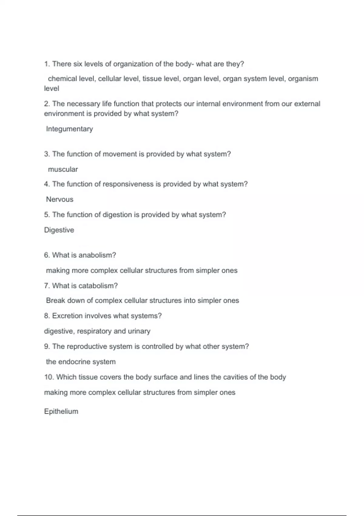 1. There six levels of organization of the body- what are they? chemical level, cellular level, tissue level, organ level, organ system level, organism level 2. The necessary life function that protects our internal environment from our external environment is provided by what system? Integumentary 3. The function of movement is provided by what system? muscular 4. The function of responsiveness is provided by what system? Nervous 5. The function of digestion is provided by what system? Digestive 6. What is anabolism? making more complex cellular structures from simpler ones 7. What is catabolism? Break down of complex cellular structures into simpler ones 8. Excretion involves what systems? digestive, respiratory and urinary 9. The reproductive system is controlled by what other system? the endocrine system 10. Which tissue covers the body surface and lines the cavities of the body making more complex cellular structures from simpler ones Epithelium 11. Name the three steps in cellular respiration. glycolysis, citric acid cycle, electron transport chain 12. What is the purpose of ATP? ATP is a very energy rich molecule the powers the cellular activities allowing cells to have the energy needed to carry out their functions. 13. Epithelial cells perform what types of functions? The cells that make up epithelial tissue are specialized for tasks such as secretion and absorption. These cells are under constant cell division to replace dead cells that shed away. 14. What are the four basic tissue types? The four basic tissue types in the human body are epithelium, muscle, connective and nervous tissue, each of which is made up of specific cell types that perform specific functions. 15. Review the figures in this lecture to recognize the major body systems. -Integumentary system -Skeletal System -Muscular System -Nervous System -Digestive System -Endocrine System -Cardiovascular system -Lymphatic system -Respiratory system -Reproductive system