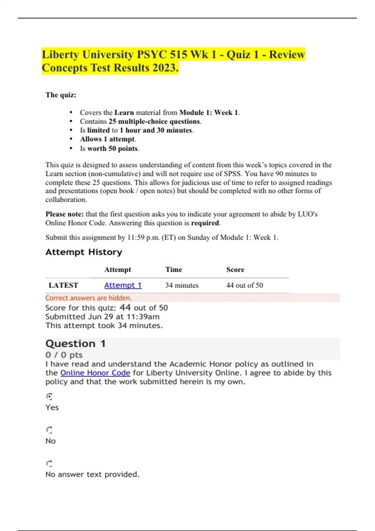 Liberty University PSYC 515 Wk 1 - Quiz 1 - Review Concepts Test Results 2023. The quiz: • Covers the Learn material from Module 1: Week 1. • Contains 25 multiple-choice questions. • Is limited to 1 hour and 30 minutes. • Allows 1 attempt. • Is worth 50 points. This quiz is designed to assess understanding of content from this week’s topics covered in the Learn section (non-cumulative) and will not require use of SPSS. You have 90 minutes to complete these 25 questions. This allows for judicious use of time to refer to assigned readings and presentations (open book / open notes) but should be completed with no other forms of collaboration. Please note: that the first question asks you to indicate your agreement to abide by LUO's Online Honor Code. Answering this question is required. Submit this assignment by 11:59 p.m. (ET) on Sunday of Module 1: Week 1. Attempt History Attempt Time Score LATEST Attempt 1 34 minutes 44 out of 50 Score for this quiz: 44 out of 50 Submitted Jun 29 at 11:39am This attempt took 34 minutes. I have read and understand the Academic Honor policy as outlined in the Online Honor Code for Liberty University Online. I agree to abide by this policy and that the work submitted herein is my own. Yes No No answer text provided.