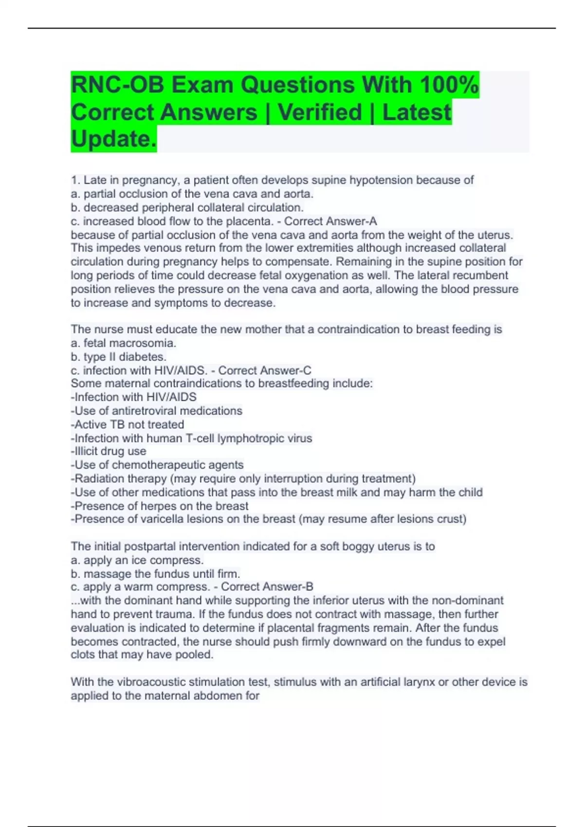 RNC-OB Exam Questions With 100% Correct Answers | Verified | Latest Update.