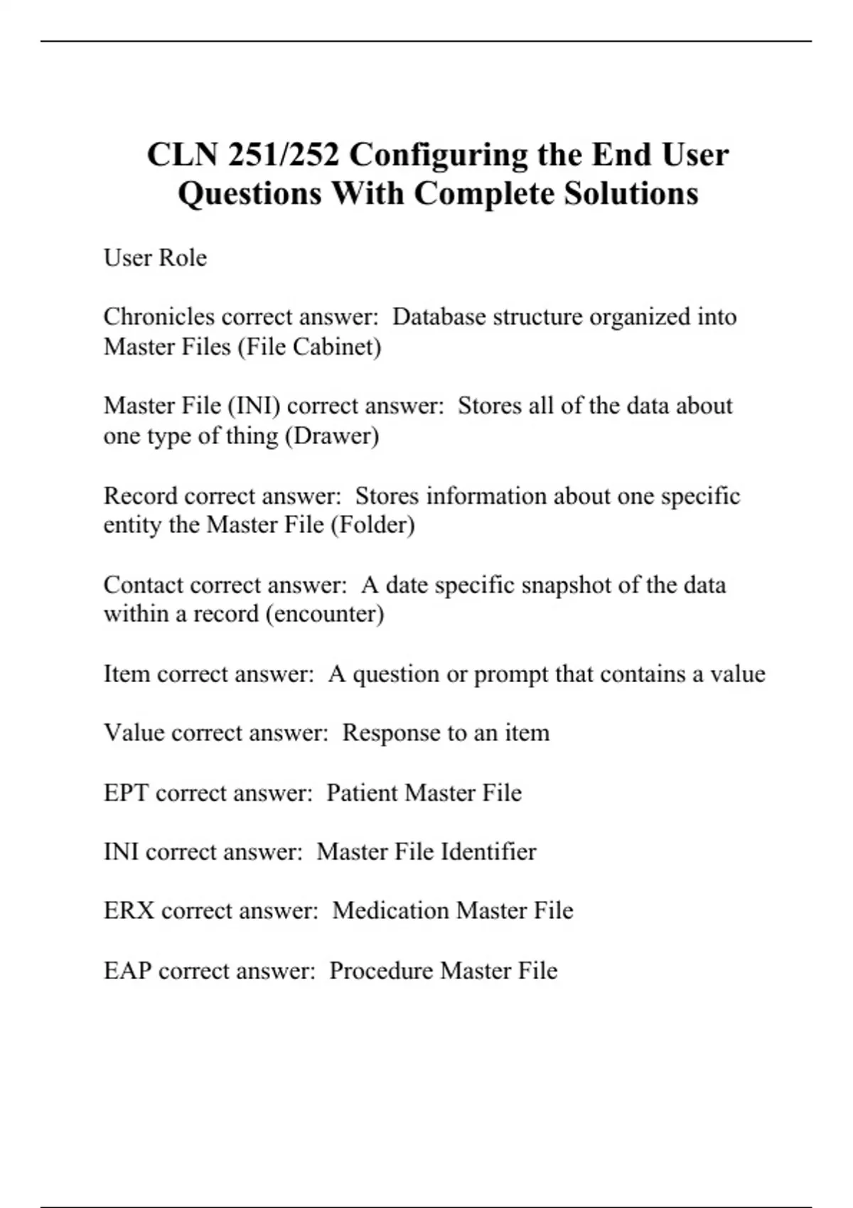 User Role Chronicles correct answer: Database structure organized into Master Files (File Cabinet) Master File (INI) correct answer: Stores all of the data about one type of thing (Drawer) Record correct answer: Stores information about one specific entity the Master File (Folder) Contact correct answer: A date specific snapshot of the data within a record (encounter) Item correct answer: A question or prompt that contains a value Value correct answer: Response to an item EPT correct answer: Patient Master File INI correct answer: Master File Identifier ERX correct answer: Medication Master File EAP correct answer: Procedure Master File Report correct answer: A collection of Print Groups Print Groups correct answer: Query Chronicles database and information in a specific format Native HTML correct answer: Report style that supports more advanced formatting and functionality Rich Text correct answer: Most common report style Plain Text correct answer: Report style with least formatting LRP correct answer: Report Master File LPG correct answer: Print Group Master File LPR correct answer: Profile Master File Profile Record correct answer: Configure an End Users options with Activities EMP correct answer: User Template ECL correct answer: EpicCare Security DEP correct answer: Department EAF correct answer: Location/ Service Area LSD correct answer: System Definitions Profile Hierarchy correct answer: Profiles can be linked to six different records Navigator correct answer: Organize workflows into a l