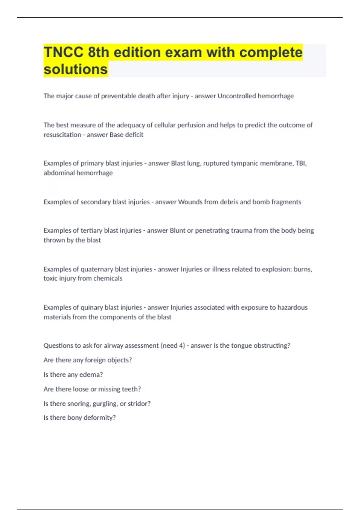 The major cause of preventable death after injury Uncontrolled hemorrhage The best measure of the adequacy of cellular perfusion and helps to predict the outcome of resuscitation Base deficit Examples of primary blast injuries Blast lung, ruptured tympanic membrane, TBI, abdominal hemorrhage Examples of secondary blast injuries Wounds from debris and bomb fragments Examples of tertiary blast injuries Blunt or penetrating trauma from the body being thrown by the blast Examples of quaternary blast injuries Injuries or illness related to explosion: burns, toxic injury from chemicals Examples of quinary blast injuries Injuries associated with exposure to hazardous materials from the components of the blast Questions to ask for airway assessment (need 4) Is the tongue obstructing? Are there any foreign objects? Is there any edema? Are there loose or missing teeth? Is there snoring, gurgling, or stridor? Is there bony deformity? Is there blood, vomit, or secretions? Questions to ask during breathing assessment. (Need 4) Is there symmetrical chest rise? Is there spontaneous breathing? Is there tracheal deviation or JVD? What is their skin color? Are there open wounds or deformities in the chest? What's the depth, pattern, and rate of respirations? Is there increased work of breathing? Are breath sounds present and equal? 3 ways to assess ETT placement 1. Apply end tidal, assess CO2 after 5-6 breaths 2. Assess for symmetrical chest wall rise and fall 3. Auscultation over the epigastrium for gurgling and bilateral breath sounds. What do you document after placing an ETT? ETT placement at teeth or gums Situations that require a definitive airway GCS 8 or less Apnea Inhalation injury Increased risk of aspiration Anticipate decreased neuro status Severe maxo fractures Laryngeal/tracheal injury Where do you listen for breath sounds? 2nd intercostal space at midclavicular line and 5th intercostal space at anterior axillary line King airway A multidimensional esophageal airway that traps the glottis opening between an esophageal cuff and an oropharyngeal cuff 3 things to assess for circulation Palpate central pulse Assess (again) for external hemorrhage Inspect and palpate skin for color, temp, and moisture. When do you establish IV access? Right after the circulatory assessment At what point to you evaluate need for transfer or definitive care? After the primary survey How do you palpate the iliac crests? Downward and medially The 3 components of the pediatric assessment triangle Skin circulation, work of breathing, general appearance What type of fluids should you give kids with normal blood glucose? Fluids with dextrose to prevent hypoglycemia How much fluid do you give a kid? 20mL/kg What assessment finding gives concern for severe brain injury? Bulging fontanels Parkland formula 3mL x the weight in kg x % TBSA = the fluid to go over 24 hours How do you give the fluid over 24 hours in parkland formula? First half over 8 hours and second half over 16 hours Normal baseline FHR 120-160 What does Kleihaver-Betke test for? Tests for fetal RBCs I. Maternal circulation, which is abnormal and could indicate fetomaternal hemorrhage has occurred Symptoms of abruptly placentae Dark red bleeding, sudden sharp abdominal pain, "board-like" uterus, increased FHR Symptoms of uterine rupture Sudden sharp abdominal or suprapibic pain, asymmetry of uterus, decreased FHR What degree to you tilt the supine pregnant patient to prevent supine hypotension? 15 degrees 3 parts of the trauma triad of death Hypothermia, coagulopathy, metabolic acidosise Examples of obstructive shock Tension pneumo, cardiac tamponade, pulmonary artery embolism Symptoms of stage 1 of shock Change in neuro status, increased DBP, decreased UO, tachycardia Symptoms of stage 2 of shock Declining neuro status, tachycardia, narrow pulse pressure, weak thready pulse, cool skin, abnormal base deficit, increased lactate symptoms of epidural hematoma Transient LOC with a lucid period, HA, N/V, rapidly declining neuro status For what reasons would you not give mannitol? An active bleed or hypotension What is Beck triad for cardiac tamponade? Hypotension, distended neck veins, muffled heart sounds Solid abdominal organs and what are they prone to? Liver, spleen, gallbladder, pancreas, prone to lacerations Hollow abdominal organs and what are they prone to Stomach, bowels, uterus, bladder, prone to rupture Big symptom of splenic injury Left shoulder pain Where do you secure a pelvic binder? At the level of the greater trochanter and symphysis pubis What is Turners sign? Ecchymosis over the flank at the 11th and 12th ribs, in renal injury What organs do you ultrasound in a FAST exam? Bladder, liver, spleen