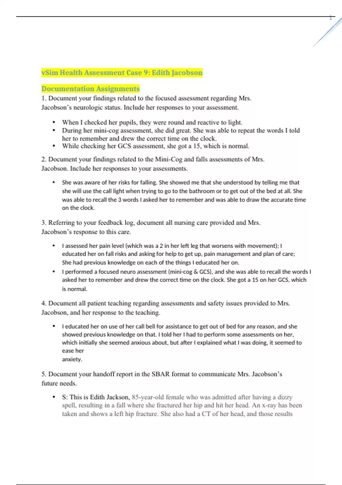 Health Assessment Case 9: Edith Jacobson Documentation Assignments