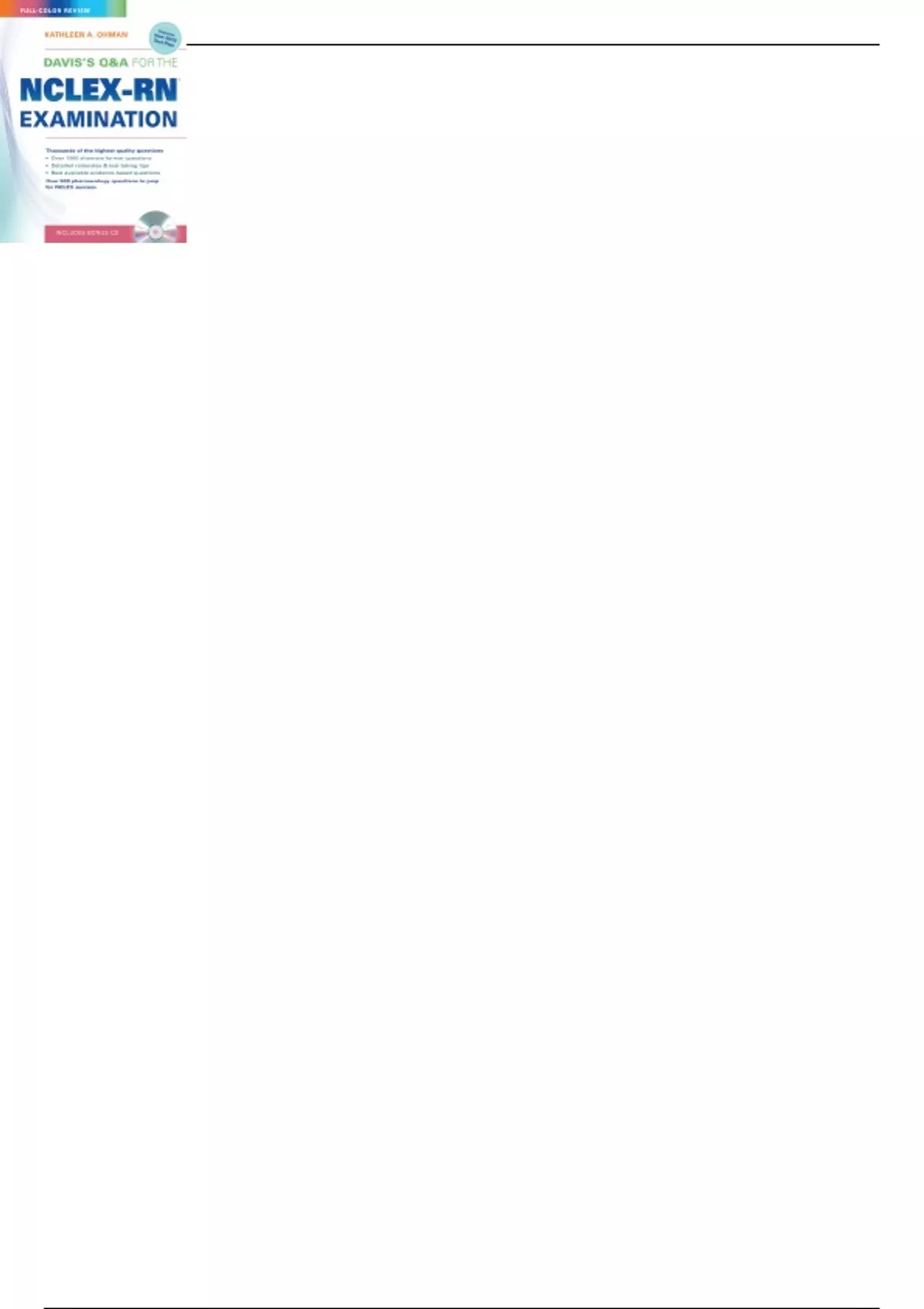 Chart/Exhibit Practice Item While performing a physical assessment on a client with a long- term history of tobacco use, a nurse notes changes in the client’s fingers (see illustration). Angle > 180 The nurse should best document this assessment finding as: 1. vitiligo. 2. clubbing. 3. keratinized. 4. poor capillary refill. ANSWER: 2 In this question, the nurse should document the finding as clubbing. The picture shows swelling at the distal end of the finger and loss of the normal 160-degree angle between the base of the nail and the skin. Clubbing results from oxygen deficiency and is often seen in clients with congenital heart defects and long-term use of tobacco. Options 1, 3, and 4 are incorrect findings. Vitiligo is patchy loss of skin pigmentation. Keratinized tissues would be hard or horny. There is no indica- tion that capillary refill has been tested. Test-takingTip:To answer items in the chart/exhibit format, identify key words in the stem, such as “history of tobacco use” and “best document.” Next, focus on the illustration or display and review the accompanying data carefully. Determine what the question is asking. Content Area: Fundamentals; Category of Health Alteration: Basic Care and Comfort; Integrated Processes: Communication and Documentation; Client Need: Health Promotion and Maintenance/Techniques of Physical Assessment; Cognitive Level: Application Reference: Berman, A., Snyder, S., Kozier, B., & Erb, G. (2008). Kozier & Erb’s Fundamentals of Nursing: Concepts, Process, and Practice (8th ed., pp. 582–583). Upper Saddle River, NJ: Pearson Education. ANSWER: 1 The “tri-foil” is the international symbol for radiation. The symbol can be magenta or black, on a yellow background. Option 2 is a universal biohazard symbol indicating a potentially infectious specimen. Option 3 is the symbol used to identify the hazard of a chemical using the National Fire Protection Associa- tion’s (NFPA) diamond. The blue diamond indicates a health hazard; with the number 3 indicating that it could cause serious injury even if treated. Red is flammability, with number 2 indi- cating that it must be preheated for flammability. The flash point is above 200°F. Yellow is the level of reactivity hazard, with a number 1 indicating that it may cause irritation. The symbol “W” indicates the substance has a special hazard of reacting when mixed with water. Option 4 is the Mr. Yuk symbol indicat- ing that a substance is a poison. Test-takingTip:To answer items in the graphic format, identify key words in the stem, such as “radiation.” Next, focus on the various graphics provided and eliminate options by deciphering the meaning of each graphic. Content Area: Fundamentals; Category of Health Alteration: Safety, Disaster Preparedness, and Infection Control; Integrated Processes: Nursing Process Planning; Client Need: Safe and Effective Care Environment/Safety and Infection Control/Accident Prevention; Cognitive Level: Application Reference: Potter, P., & Perry, A. (2009). Fundamentals of Nursing (7th ed., p. 845). St. Louis, MO: Mosby/Elsevier. BOX 2.11 Graphic Practice Item A nurse is planning care for a client who is to receive a radiation treatment later in the day. In preparing the client’s room, which sign should the nurse plan to post outside the client’s room? 1. 2. 3. 4. BOX 2.12 Audio Practice Item BOX 2.13 Safe and Effective Care Environment Management of Care: Providing and directing nursing care that enhances the care delivery setting to protect clients, family/significant others, and health-care personnel. CHAPTER 2 NCLEX-RN® Items 17 Place your headset on now. Click the Play button to listen to the audio clip. Based on the audio clip, which lung sound is the nurse hearing upon auscultation? 1. Crackles 2. Wheezes 3. Plural friction rub 4. Rhonchi An unresponsive client is admitted to an emergency room. The client’s cardiac rhythm is extremely irregular with no measurable heart rate, no P waves, and no QRS complexes. A nurse leading the resuscitation team should direct the team to perform which action first? 1. Defibrillate 2. Administer epinephrine 3. Perform synchronized cardioversion 4. Prepare for pacemaker insertion ANSWER: 1 The client’s signs are characteristic of ventricular fibrillation. Immediate defibrillation is the best intervention for termi- nating the life-threatening arrhythmia. Epinephrine should be administered according to advanced cardiac life support pro- tocols after defibrillation. Synchronized cardioversion should be performed on a client with atrial fibrillation or atrial flutter. A QRS complex must be present to synchronize the shock. A pacemaker insertion at this time is inappropriate. Test-taking Tip: Note the key word “first.” Since the client’s heart rate is absent and the rhythm irregular, eliminate options 2, 3, and 4. Content Area: Adult Health; Category of Health Alteration: Cardiac Management; Integrated Processes: Nursing Process Implementation; Client Need: Safe and Effective Care Environment/Management of Care/Delegation; Cognitive Level: Analysis Reference: Lewis, S., Heitkemper, M., Dirksen, S., O’Brien, P., & Bucher, L. (2007). Medical-Surgical Nursing: Assessment and Management of Clinical Problems (7th ed., p. 855). St. Louis, MO: Mosby. 18 SECTION I Preparing for the NCLEX-RN® BOX 2.14 Safe and Effective Care Environment Safety and Infection Control: Protecting clients, family, significant others and health-care personnel from health and environmental hazards. A nurse reports to employee health services for an injury to the hand from a needle stick. The needle was used on a client who is known to be HIV positive. Which interventions should be taken by the occupational health nurse in employee health services? SELECT ALL THAT APPLY. 1. Wash the exposed site with soap and water 2. Test for HIV antigens now, in 6 weeks, and then again in 3 months 3. Administer postexposure prophylaxis medications withi