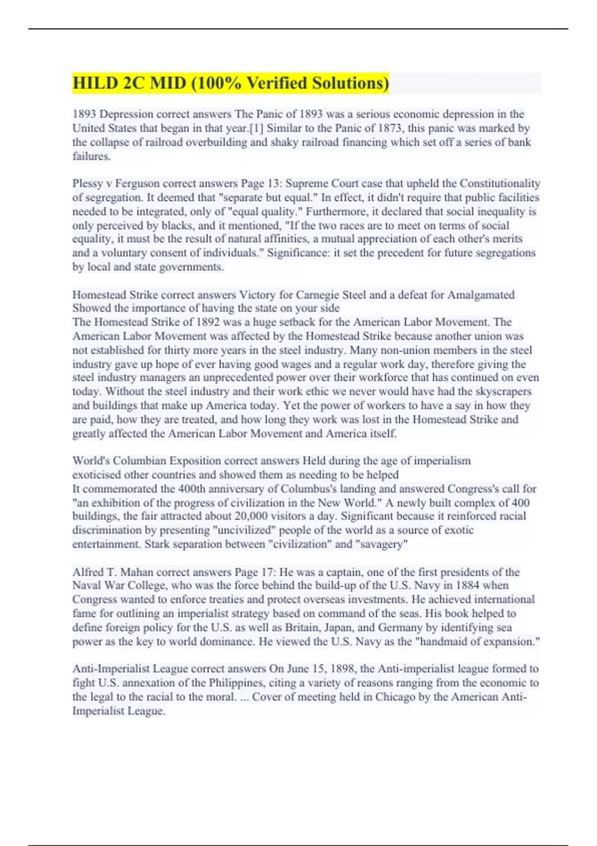 1893 Depression correct answers The Panic of 1893 was a serious economic depression in the United States that began in that year.[1] Similar to the Panic of 1873, this panic was marked by the collapse of railroad overbuilding and shaky railroad financing which set off a series of bank failures. Plessy v Ferguson correct answers Page 13: Supreme Court case that upheld the Constitutionality of segregation. It deemed that "separate but equal." In effect, it didn't require that public facilities needed to be integrated, only of "equal quality." Furthermore, it declared that social inequality is only perceived by blacks, and it mentioned, "If the two races are to meet on terms of social equality, it must be the result of natural affinities, a mutual appreciation of each other's merits and a voluntary consent of individuals." Significance: it set the precedent for future segregations by local and state governments. Homestead Strike correct answers Victory for Carnegie Steel and a defeat for Amalgamated Showed the importance of having the state on your side The Homestead Strike of 1892 was a huge setback for the American Labor Movement. The American Labor Movement was affected by the Homestead Strike because another union was not established for thirty more years in the steel industry. Many non-union members in the steel industry gave up hope of ever having good wages and a regular work day, therefore giving the steel industry managers an unprecedented power over their workforce that has continued on even today. Without the steel industry and their work ethic we never would have had the skyscrapers and buildings that make up America today. Yet the power of workers to have a say in how they are paid, how they are treated, and how long they work was lost in the Homestead Strike and greatly affected the American Labor Movement and America itself. World's Columbian Exposition correct answers Held during the age of imperialism exoticised other countries and showed them as needing to be helped It commemorated the 400th anniversary of Columbus's landing and answered Congress's call for "an exhibition of the progress of civilization in the New World." A newly built complex of 400 buildings, the fair attracted about 20,000 visitors a day. Significant because it reinforced racial discrimination by presenting "uncivilized" people of the world as a source of exotic entertainment. Stark separation between "civilization" and "savagery" Alfred T. Mahan correct answers Page 17: He was a captain, one of the first presidents of the Naval War College, who was the force behind the build-up of the U.S. Navy in 1884 when Congress wanted to enforce treaties and protect overseas investments. He achieved international fame for outlining an imperialist strategy based on command of the seas. His book helped to define foreign policy for the U.S. as well as Britain, Japan, and Germany by identifying sea power as the key to world dominance. He viewed the U.S. Navy as the "handmaid of expansion." Anti-Imperialist League correct answers On June 15, 1898, the Anti-imperialist league formed to fight U.S. annexation of the Philippines, citing a variety of reasons ranging from the economic to the legal to the racial to the moral. ... Cover of meeting held in Chicago by the American Anti-Imperialist League.