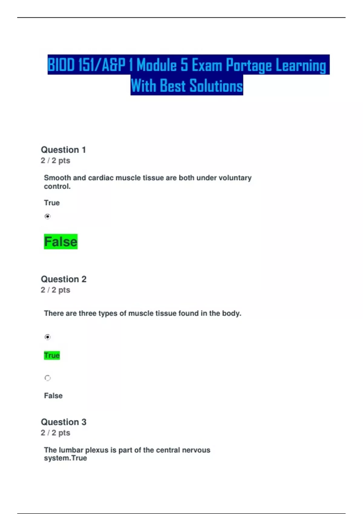 BIOD 151/A&P 1 Module 5 Exam Portage Learning With Best Solutions Question 1 2 / 2 pts Smooth and cardiac muscle tissue are both under voluntary control. True False Question 2 2 / 2 pts There are three types of muscle tissue found in the body. True False Question 3 2 / 2 pts The lumbar plexus is part of the central nervous system.True False False- this is a peripheral nerve Question 7 2 / 2 pts Question 4 2 / 2 pts A motor signal is a signal that is sent from a muscle to the central nervous system. True False False- this is sensory input