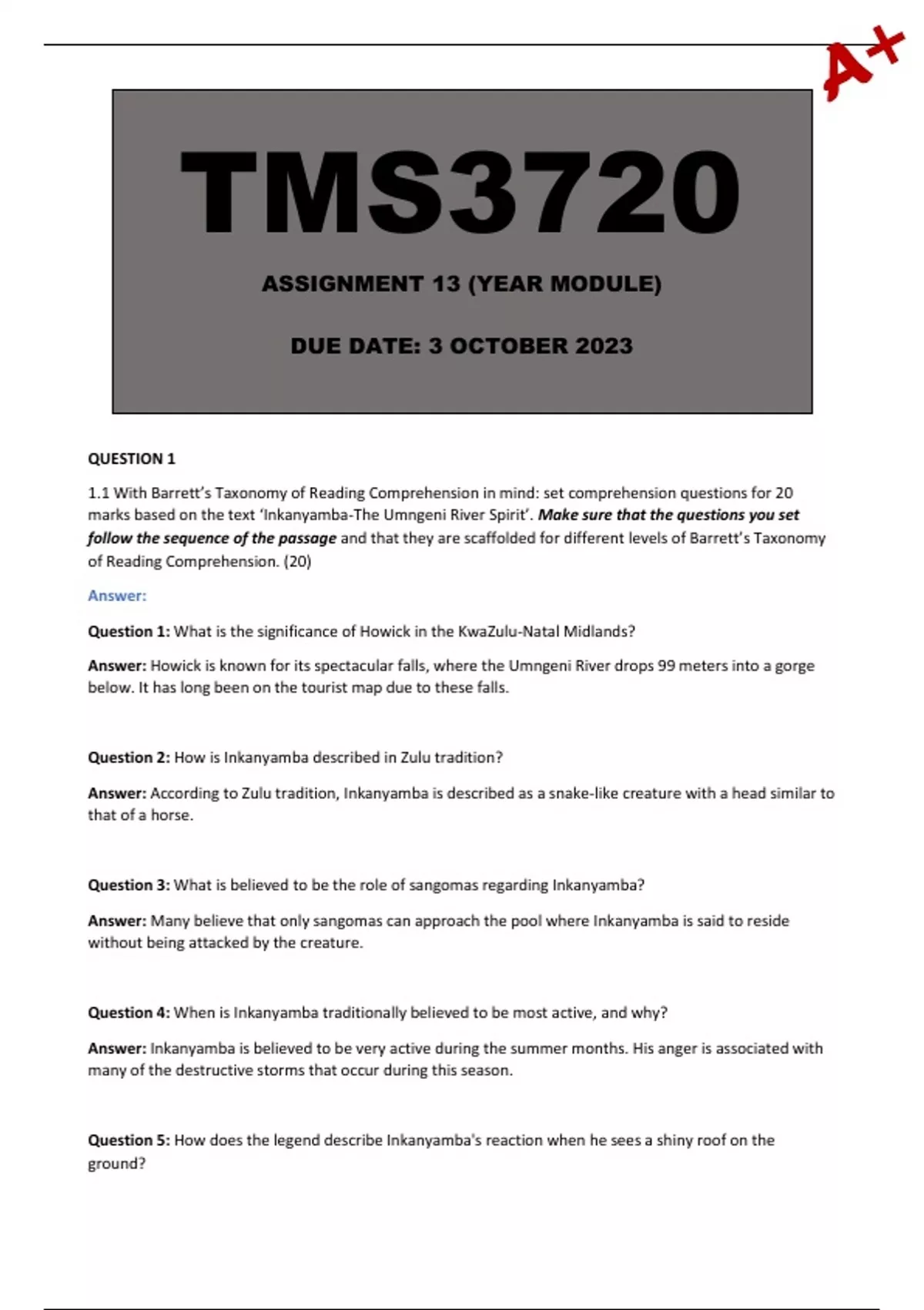 marks based on the text ‘Inkanyamba-The Umngeni River Spirit’. Make sure that the questions you set