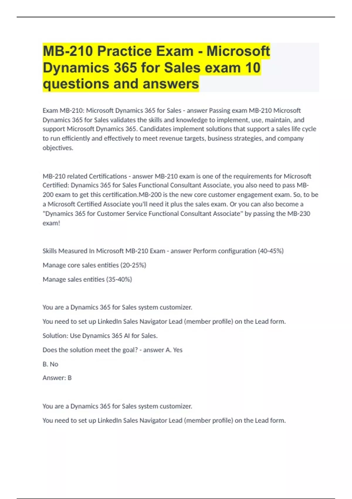 Exam MB-210: Microsoft Dynamics 365 for Sales - answer Passing exam MB-210 Microsoft