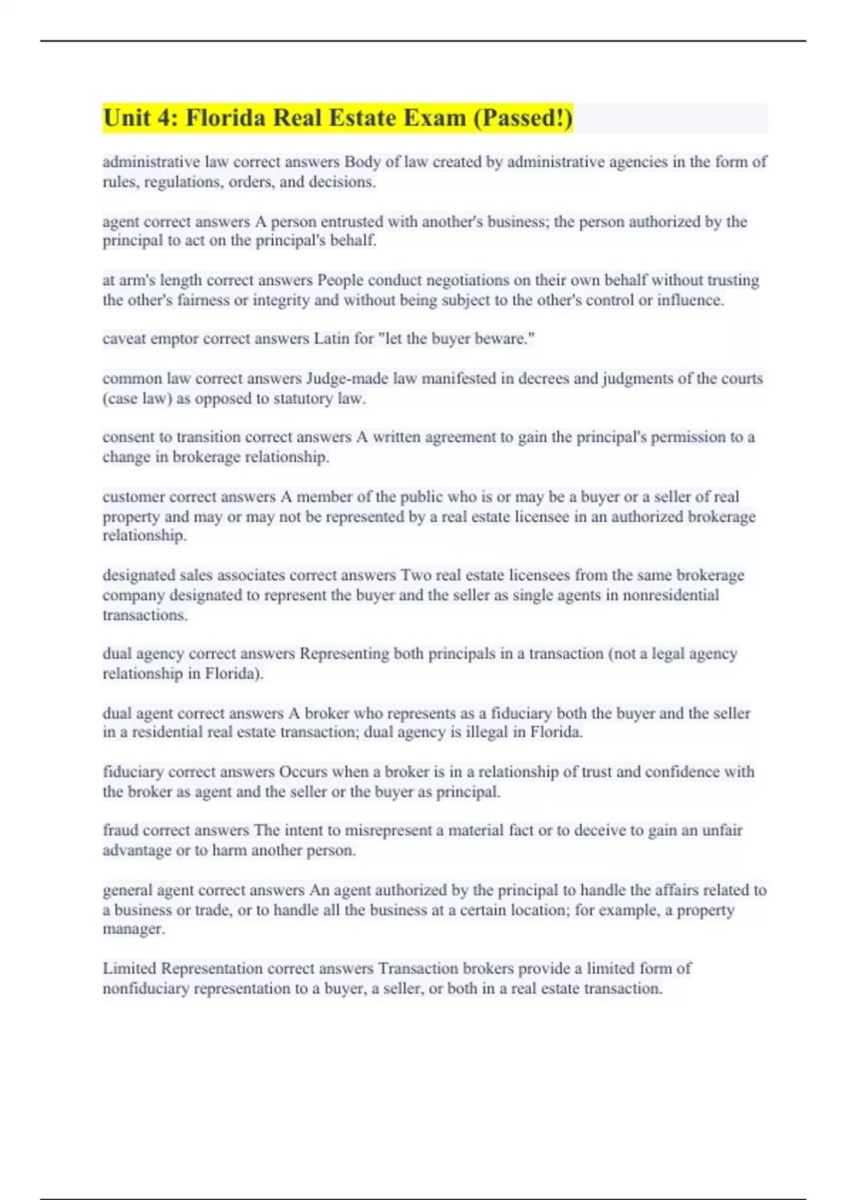 administrative law correct answers Body of law created by administrative agencies in the form of rules, regulations, orders, and decisions. agent correct answers A person entrusted with another's business; the person authorized by the principal to act on the principal's behalf. at arm's length correct answers People conduct negotiations on their own behalf without trusting the other's fairness or integrity and without being subject to the other's control or influence. caveat emptor correct answers Latin for "let the buyer beware." common law correct answers Judge-made law manifested in decrees and judgments of the courts (case law) as opposed to statutory law. consent to transition correct answers A written agreement to gain the principal's permission to a change in brokerage relationship. customer correct answers A member of the public who is or may be a buyer or a seller of real property and may or may not be represented by a real estate licensee in an authorized brokerage relationship. designated sales associates correct answers Two real estate licensees from the same brokerage company designated to represent the buyer and the seller as single agents in nonresidential transactions. dual agency correct answers Representing both principals in a transaction (not a legal agency relationship in Florida). dual agent correct answers A broker who represents as a fiduciary both the buyer and the seller in a residential real estate transaction; dual agency is illegal in Florida. fiduciary correct answers Occurs when a broker is in a relationship of trust and confidence with the broker as agent and the seller or the buyer as principal. fraud correct answers The intent to misrepresent a material fact or to deceive to gain an unfair advantage or to harm another person. general agent correct answers An agent authorized by the principal to handle the affairs related to a business or trade, or to handle all the business at a certain location; for example, a property manager. Limited Representation correct answers Transaction brokers provide a limited form of nonfiduciary representation to a buyer, a seller, or both in a real estate transaction.