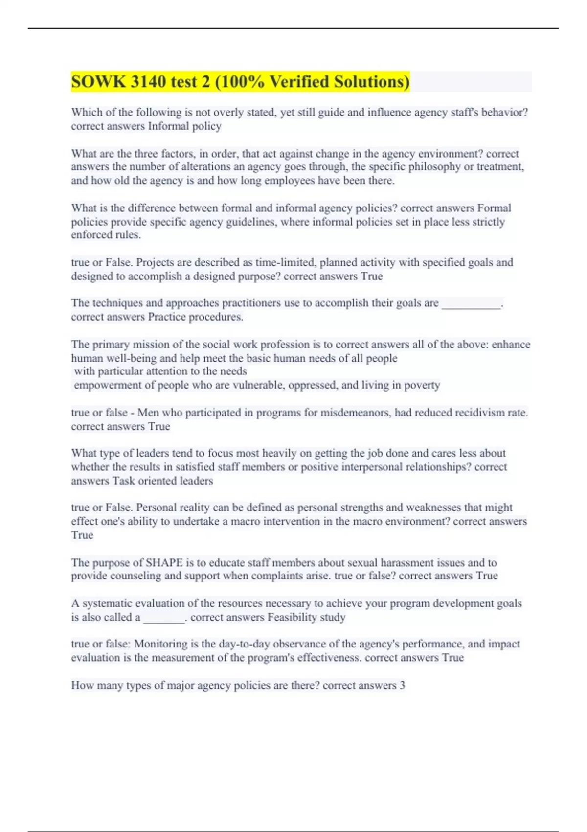 Which of the following is not overly stated, yet still guide and influence agency staff's behavior? correct answers Informal policy What are the three factors, in order, that act against change in the agency environment? correct answers the number of alterations an agency goes through, the specific philosophy or treatment, and how old the agency is and how long employees have been there. What is the difference between formal and informal agency policies? correct answers Formal policies provide specific agency guidelines, where informal policies set in place less strictly enforced rules. true or False. Projects are described as time-limited, planned activity with specified goals and designed to accomplish a designed purpose? correct answers True The techniques and approaches practitioners use to accomplish their goals are __________. correct answers Practice procedures. The primary mission of the social work profession is to correct answers all of the above: enhance human well-being and help meet the basic human needs of all people with particular attention to the needs empowerment of people who are vulnerable, oppressed, and living in poverty true or false - Men who participated in programs for misdemeanors, had reduced recidivism rate. correct answers True What type of leaders tend to focus most heavily on getting the job done and cares less about whether the results in satisfied staff members or positive interpersonal relationships? correct answers Task oriented leaders true or False. Personal reality can be defined as personal strengths and weaknesses that might effect one's ability to undertake a macro intervention in the macro environment? correct answers True The purpose of SHAPE is to educate staff members about sexual harassment issues and to provide counseling and support when complaints arise. true or false? correct answers True A systematic evaluation of the resources necessary to achieve your program development goals is also called a _______. correct answers Feasibility study true or false: Monitoring is the day-to-day observance of the agency's performance, and impact evaluation is the measurement of the program's effectiveness. correct answers True How many types of major agency policies are there? correct answers 3