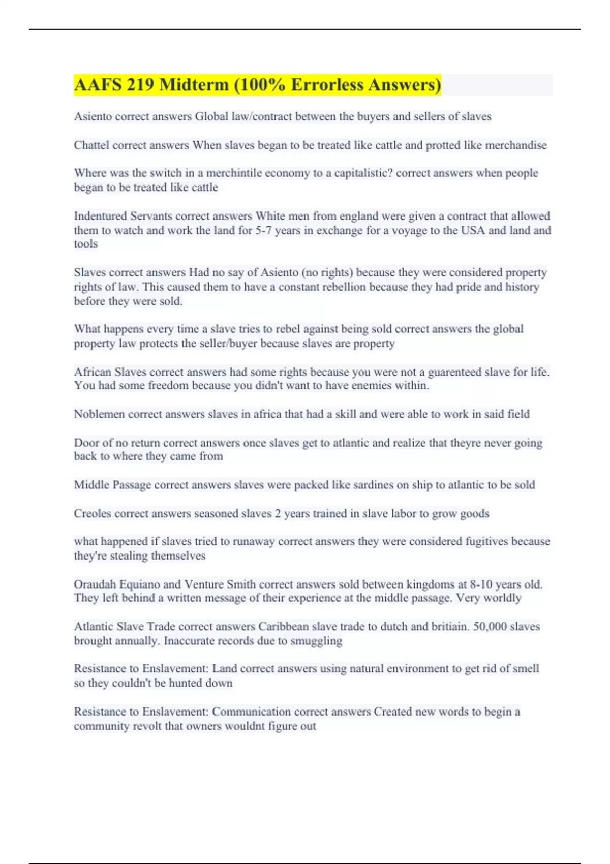 Asiento correct answers Global law/contract between the buyers and sellers of slaves Chattel correct answers When slaves began to be treated like cattle and protted like merchandise Where was the switch in a merchintile economy to a capitalistic? correct answers when people began to be treated like cattle Indentured Servants correct answers White men from england were given a contract that allowed them to watch and work the land for 5-7 years in exchange for a voyage to the USA and land and tools Slaves correct answers Had no say of Asiento (no rights) because they were considered property rights of law. This caused them to have a constant rebellion because they had pride and history before they were sold. What happens every time a slave tries to rebel against being sold correct answers the global property law protects the seller/buyer because slaves are property African Slaves correct answers had some rights because you were not a guarenteed slave for life. You had some freedom because you didn't want to have enemies within. Noblemen correct answers slaves in africa that had a skill and were able to work in said field Door of no return correct answers once slaves get to atlantic and realize that theyre never going back to where they came from Middle Passage correct answers slaves were packed like sardines on ship to atlantic to be sold Creoles correct answers seasoned slaves 2 years trained in slave labor to grow goods what happened if slaves tried to runaway correct answers they were considered fugitives because they're stealing themselves Oraudah Equiano and Venture Smith correct answers sold between kingdoms at 8-10 years old. They left behind a written message of their experience at the middle passage. Very worldly Atlantic Slave Trade correct answers Caribbean slave trade to dutch and britiain. 50,000 slaves brought annually. Inaccurate records due to smuggling Resistance to Enslavement: Land correct answers using natural environment to get rid of smell so they couldn't be hunted down Resistance to Enslavement: Communication correct answers Created new words to begin a community revolt that owners wouldnt figure out