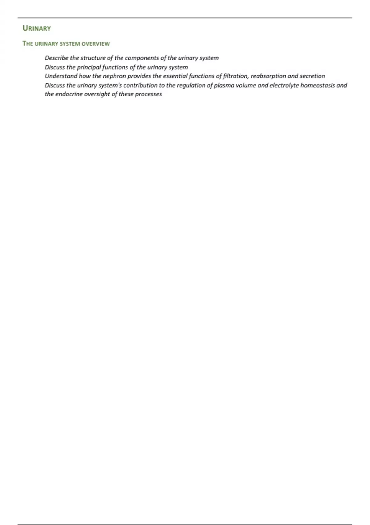 Lecture notes containing; Structure of kidneys and function Primary functions of the urinary system Nephron Tubule Plasma volume management The renal corpuscle Bowman's capsules Proximal Convoluted tube PCT collectin ducts and their functions ADH and its role in plasma osmolality