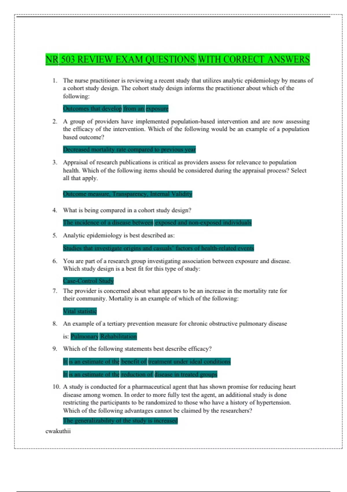 NR 503 REVIEW EXAM QUESTIONS WITH CORRECT ANSWERS 1. The nurse practitioner is reviewing a recent study that utilizes analytic epidemiology by means of a cohort study design. The cohort study design informs the practitioner about which of the following: Outcomes that develop from an exposure 2. A group of providers have implemented population-based intervention and are now assessing the efficacy of the intervention. Which of the following would be an example of a population based outcome? Decreased mortality rate compared to previous year 3. Appraisal of research publications is critical as providers assess for relevance to population health. Which of the following items should be considered during the appraisal process? Select all that apply. Outcome measure, Transparency, Internal Validity 4. What is being compared in a cohort study design? The incidence of a disease between exposed and non-exposed individuals 5. Analytic epidemiology is best described as: Studies that investigate origins and casuals’ factors of health-related events 6. You are part of a research group investigating association between exposure and disease. Which study design is a best fit for this type of study: Case-Control Study 7. The provider is concerned about what appears to be an increase in the mortality rate for their community. Mortality is an example of which of the following: Vital statistic 8. An example of a tertiary prevention measure for chronic obstructive pulmonary disease is: Pulmonary Rehabilitation 9. Which of the following statements best describe efficacy? It is an estimate of the benefit of treatment under ideal conditions It is an estimate of the reduction of disease in treated groups 10. A study is conducted for a pharmaceutical agent that has shown promise for reducing heart disease among women. In order to more fully test the agent, an additional study is done restricting the participants to be randomized to those who have a history of hypertension. Which of the following advantages cannot be claimed by the researchers? The generalizability of the study is increased