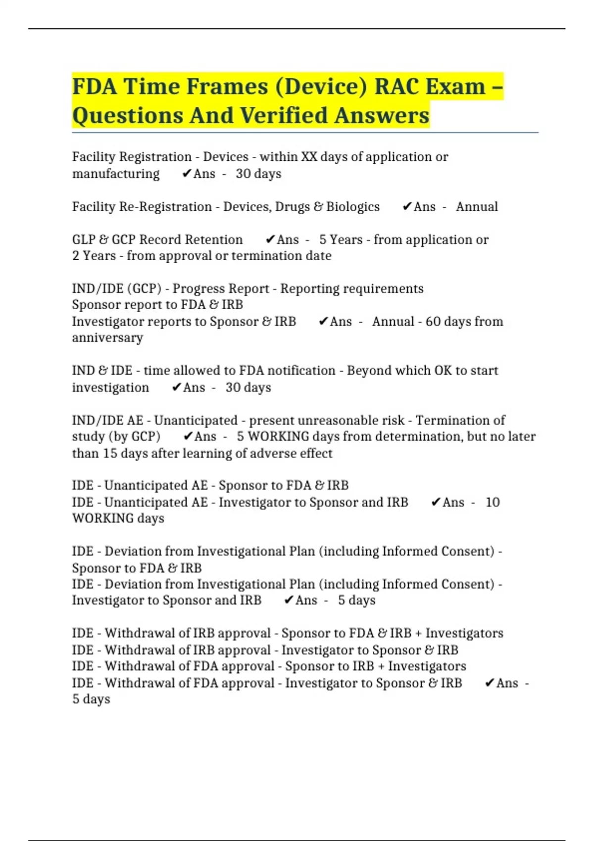 FDA Time Frames (Device) RAC Exam – Questions And Verified Answers