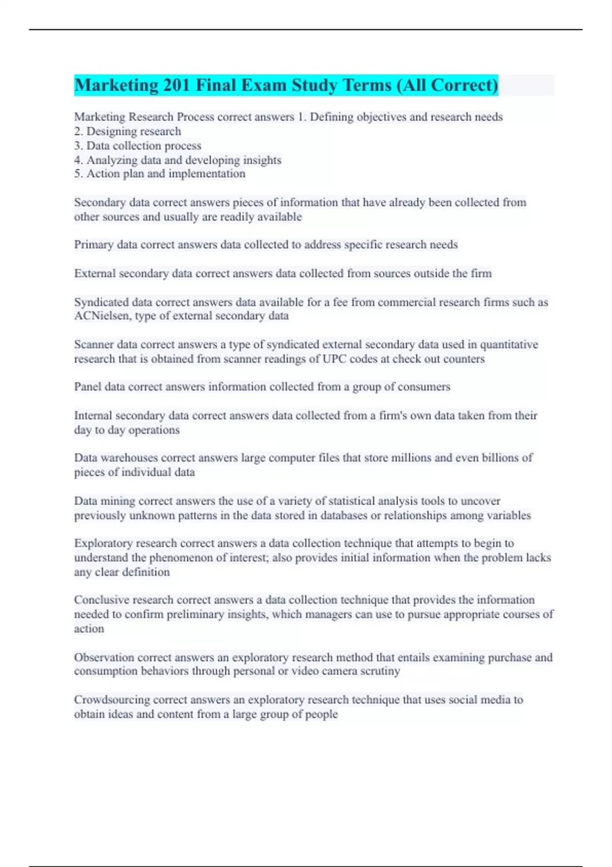 Marketing Research Process correct answers 1. Defining objectives and research needs 2. Designing research 3. Data collection process 4. Analyzing data and developing insights 5. Action plan and implementation Secondary data correct answers pieces of information that have already been collected from other sources and usually are readily available Primary data correct answers data collected to address specific research needs External secondary data correct answers data collected from sources outside the firm Syndicated data correct answers data available for a fee from commercial research firms such as ACNielsen, type of external secondary data Scanner data correct answers a type of syndicated external secondary data used in quantitative research that is obtained from scanner readings of UPC codes at check out counters Panel data correct answers information collected from a group of consumers Internal secondary data correct answers data collected from a firm's own data taken from their day to day operations Data warehouses correct answers large computer files that store millions and even billions of pieces of individual data Data mining correct answers the use of a variety of statistical analysis tools to uncover previously unknown patterns in the data stored in databases or relationships among variables Exploratory research correct answers a data collection technique that attempts to begin to understand the phenomenon of interest; also provides initial information when the problem lacks any clear definition Conclusive research correct answers a data collection technique that provides the information needed to confirm preliminary insights, which managers can use to pursue appropriate courses of action Observation correct answers an exploratory research method that entails examining purchase and consumption behaviors through personal or video camera scrutiny Crowdsourcing correct answers an exploratory research technique that uses social media to obtain ideas and content from a large group of people