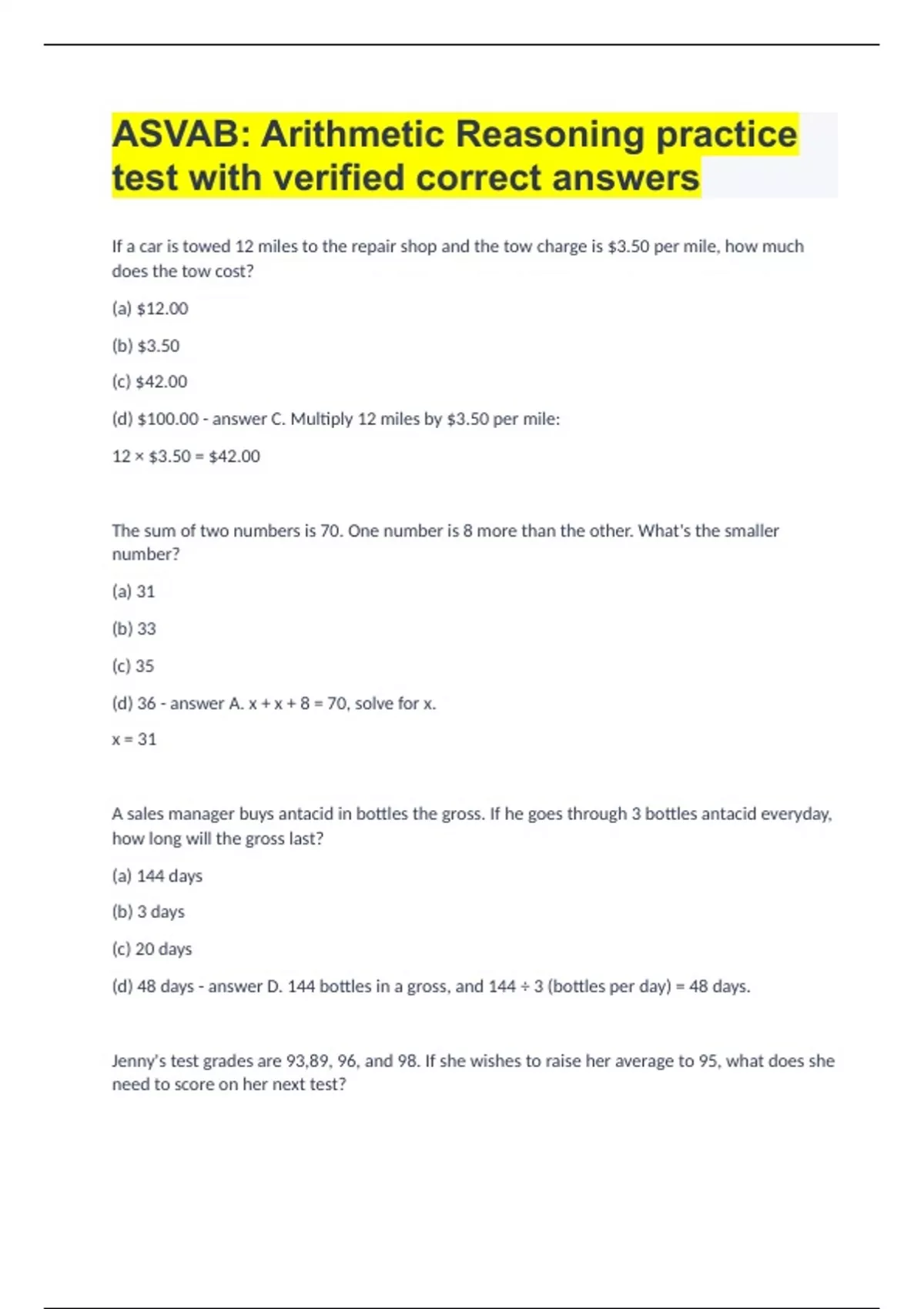 (d) 95 - answer B. x = the unknown score. (93 + 89 + 96 + 98 + x) ÷ 5 or (376 + x) ÷ 5. Now solve