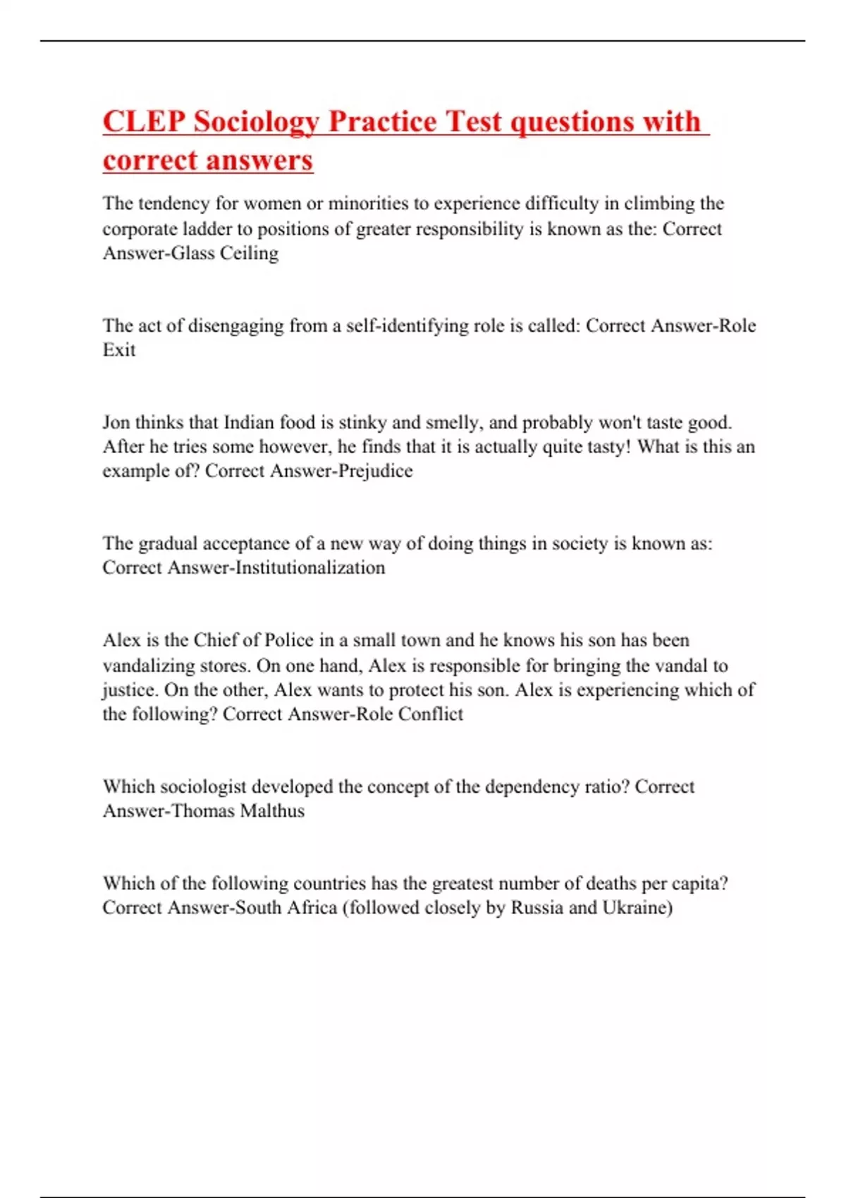 The tendency for women or minorities to experience difficulty in climbing the corporate ladder to positions of greater responsibility is known as the: Correct Answer-Glass Ceiling The act of disengaging from a self-identifying role is called: Correct Answer-Role Exit Jon thinks that Indian food is stinky and smelly, and probably won't taste good. After he tries some however, he finds that it is actually quite tasty! What is this an example of? Correct Answer-Prejudice The gradual acceptance of a new way of doing things in society is known as: Correct Answer-Institutionalization Alex is the Chief of Police in a small town and he knows his son has been vandalizing stores. On one hand, Alex is responsible for bringing the vandal to justice. On the other, Alex wants to protect his son. Alex is experiencing which of the following? Correct Answer-Role Conflict Which sociologist developed the concept of the dependency ratio? Correct Answer-Thomas Malthus Which of the following countries has the greatest number of deaths per capita? Correct Answer-South Africa (followed closely by Russia and Ukraine) The "looking glass self," which describes the image we have of ourselves based on how we believe others to perceive us, was first