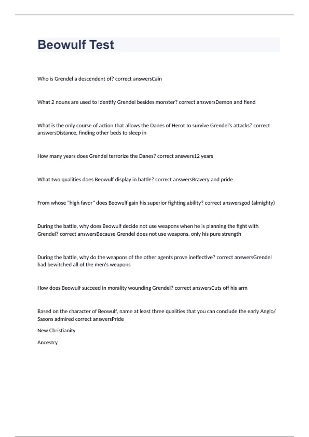 Who is Grendel a descendent of? correct answersCain What 2 nouns are used to identify Grendel besides monster? correct answersDemon and fiend What is the only course of action that allows the Danes of Herot to survive Grendel's attacks? correct answersDistance, finding other beds to sleep in How many years does Grendel terrorize the Danes? correct answers12 years What two qualities does Beowulf display in battle? correct answersBravery and pride From whose "high favor" does Beowulf gain his superior fighting ability? correct answersgod (almighty) During the battle, why does Beowulf decide not use weapons when he is planning the fight with Grendel? correct answersBecause Grendel does not use weapons, only his pure strength During the battle, why do the weapons of the other agents prove ineffective? correct answersGrendel had bewitched all of the men's weapons How does Beowulf succeed in morality wounding Grendel? correct answersCuts off his arm Based on the character of Beowulf, name at least three qualities that you can conclude the early Anglo/ Saxons admired correct answersPride New Christianity Ancestry
