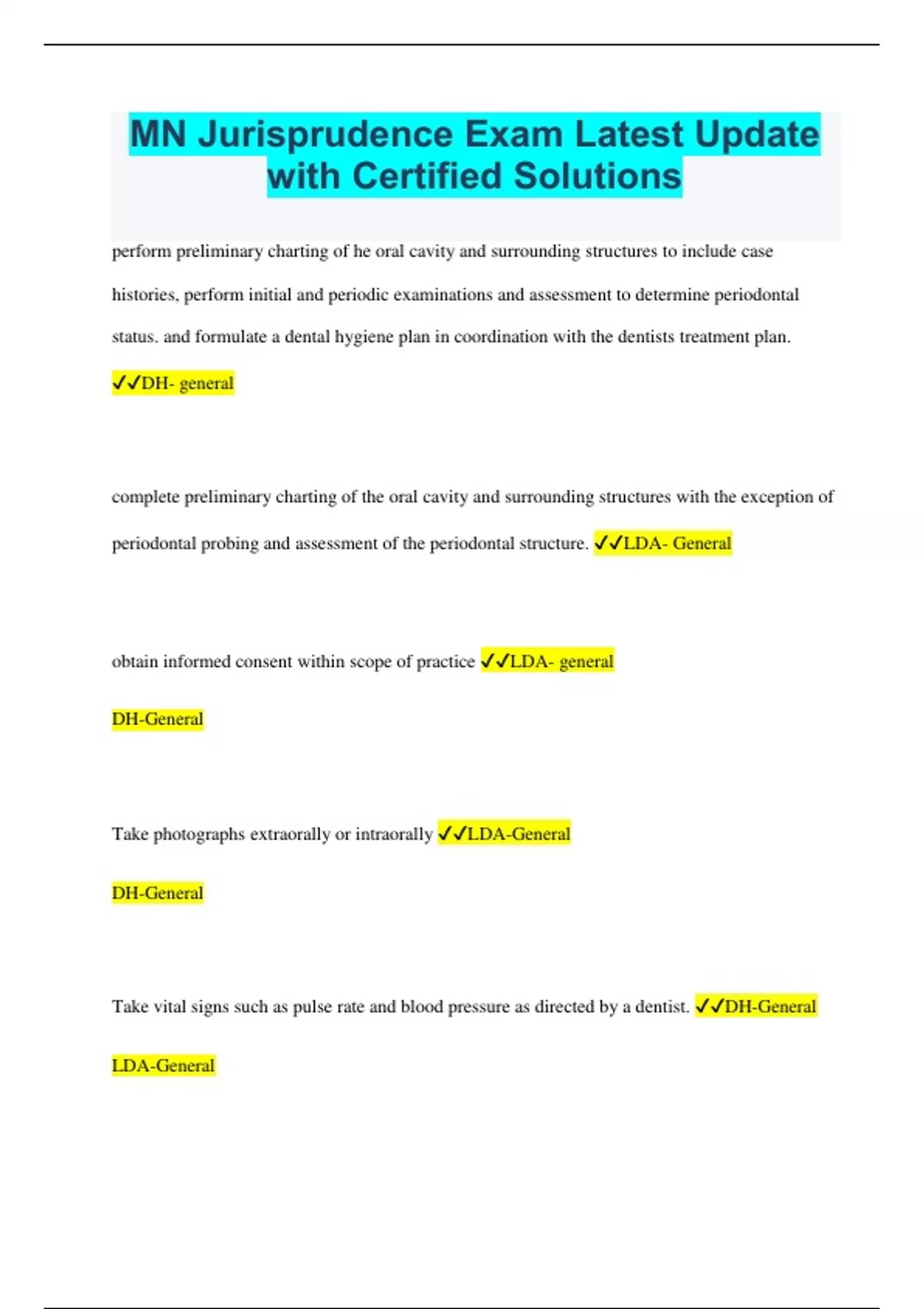 MN Jurisprudence Exam Latest Update with Certified Solutions perform preliminary charting of he oral cavity and surrounding structures to include case histories, perform initial and periodic examinations and assessment to determine periodontal status. and formulate a dental hygiene plan in coordination with the dentists treatment plan. DH- general complete preliminary charting of the oral cavity and surrounding structures with the exception of periodontal probing and assessment of the periodontal structure. LDA- General obtain informed consent within scope of practice LDA- general DH-General Take photographs extraorally or intraorally LDA-General DH-General Take vital signs such as pulse rate and blood pressure as directed by a dentist. DH-General LDA-General Make referrals to dentists, physicians, and other practitioners in consultation with a Dentist. DH-General Complete prophylaxis to include scaling, root planning, polishing of restorations. DH-General Dietary analysis, salivary analysis and preparation of smears for the dental health purposes. DH- General replacement, cementation, and adjustment of intact temporary restorations extraorally or intraorally DH-General recement intact temporary restorations DH-General LDA- General Place temporary fillings (not including temporization of inlays, onlays, crowns, and bridges) DH-General LDA-General Cut arch wires, remove loose bands, or remove loose brackets on orthodontic appliances. DH-General LDA-General Remove excess bond material from orthodontic appliances. DH- General LDA-Direct remove bond material from teeth with rotary instruments are removal of orthodontic appliances DH-Direct LDA-Direct Etch appropriate enamel surfaces, apply and adjust pits and fissures DH- General LDA-Indirect Administer local anesthesia DH-General Administer nitrous oxide inhalation analgesia pursuant to the rule provisions. DH-General LDA- Direct Monitor a patient who has been induced by a dentist into nitrous oxide oxygen relative analgesia DH-General LDA-Indirect perform restorative procedures limited to: placing contouring, adjusting amalgam restorations, glass ionomers, and supragingival composite restorations (class 1, and V) where the margins are entirely within the enamel on permanent/primary teeth; adapting and cementing stainless steel crowns on permanent/ primary teeth; and placing, contouring, and adjusting suprgingival composite restorations (class V and ll) on primary teeth DH- Indirect LDA- Indirect Place and remove matrix bands DH-Direct LDA-Direct remove marginal overhangs DH-General Fabricate, cement, and adjust temporary restorations extraorally and intraorally DH- Direct LDA- Direct remove temporary restorations with hand instruments only DH- Direct LDA- Direct etch appropriate enamel surfaces before bonding of orthodontic appliances by a dentist DH- Direct LDA-Direct Perform mechanical polishing to clinical crowns not including instrumentation. removal of calculus by instrumentation must be done by the dentist or dental hygienist before mechanical polishing. DH-General LDA-Indirect Take radiographs DH-General LDA-General remove excess cement from inlays, crowns, bridges and orthodontic appliances with hand instruments only. DH- General LDA-Indirect Apply topical medications such as, but not limited to, topical fluoride, bleaching agents, and cavity varnishes in appropriate dosages or quantities as prescribed by a dentist DH- General LDA-Indirect Take impressions for casts and appropriate bite registrations DH-General LDA- General place and remove rubber dam DH- General LDA-Indirect pre select orthodontic bands DH-General LDA-Indirect Place and remove elastic orthodontic seperators DH-General LDA-General Attach prefit and preadjusted orthodontic appliances DH- DIrect LDA-Direct remove and replace ligature ties and arch wires on orthodontic appliances DH-General LDA-Indirect removed fixed orthodontics bands and brackets DH- Direct LDA-Direct Deliver vacuum formed orthodontic retainers DH-General LDA-General Remove sutures DH- General LDA-Indirect Place and remove periodontal packs DH-General LDA-Indirect Dry root canals with paper points DH-General LDA- Indirect Place cotton pellets and temporary restorative materials into endodontic openings DH-General LDA-Indirect maintain and remove intravenous lines under supervision of dentist holding valid general anesthesia or moderate sedation certificate DH-indirect LDA-Indirect Monitor a patient during each phase of general anesthesia or moderate sedation using non invasive instrumentation under supervision of dentist holding a valid general anesthesia or moderate sedation certificate DH-Indirect LDA-Indirect initiate and place an intravenous infusion line in preparation for intravenous medication and sedation under supervision of dentist holding valid general anesthesia or moderate sedation certificate DH-Direct LDA-Direct Place nonsurgical retraction material for gingival displacement DH-DIrect LDA-direct A dental technician who repairs patients dentures at the request of the patient would be practicing dentistry without a license True or False True An LDA, hygienist, or dental tech who performs dental services than as an employee for a dentist would be practicing dentistry without a license True or False True when electronic records are kept a dentist must keep either a duplicate hard copy record or use an unalterable electronics record True or False True A dentist shall maintain a patients dental record for at least 8 years beyond the time the dentist last treated the patient true or false False It is illegal for a dentist to imply superiority over other dentists in advertisement True or False True In order to become licenses in MN as a dentist, or dental hygienist or licensed dental assistant among either requirements an applicant must successfully complete training at school program accredited by the american dental associations commission on dental accreditation True Gowns should be bagged