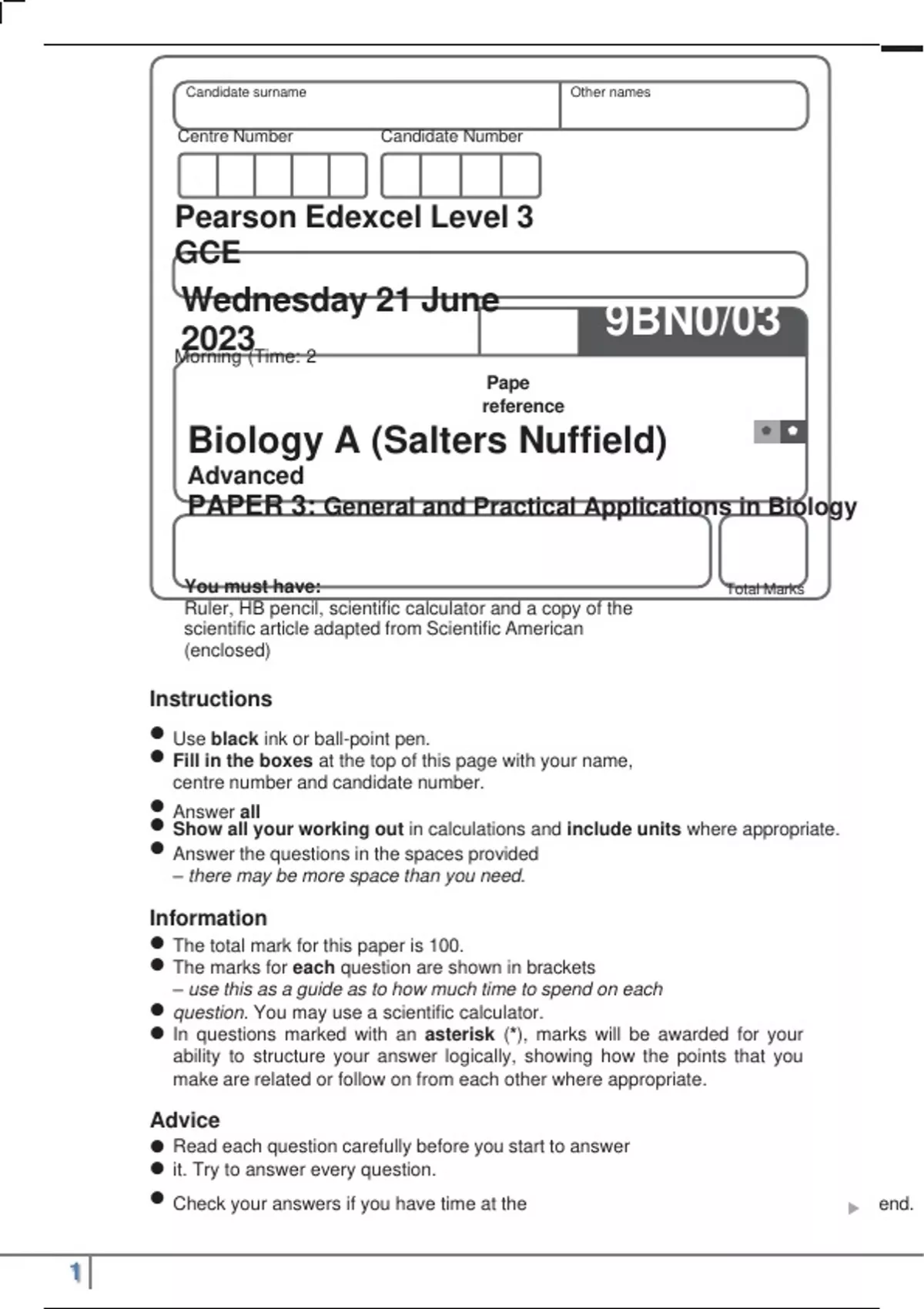 Pearson Edexcel Biology A Advanced PAPER 3 General and Practical Applications in Biology June 2023