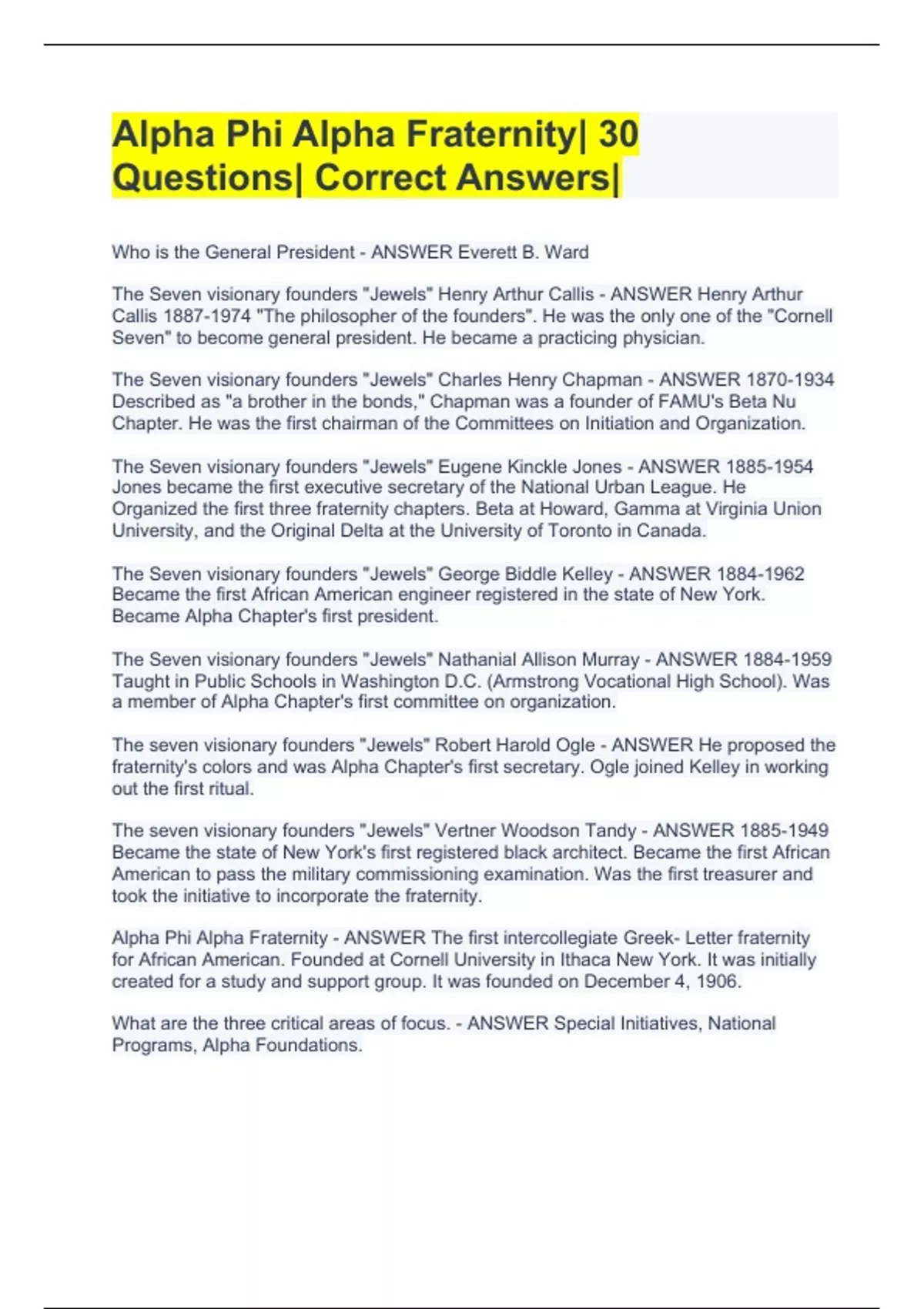 Alpha Phi Alpha Fraternity| 30 Questions| Correct Answers|
