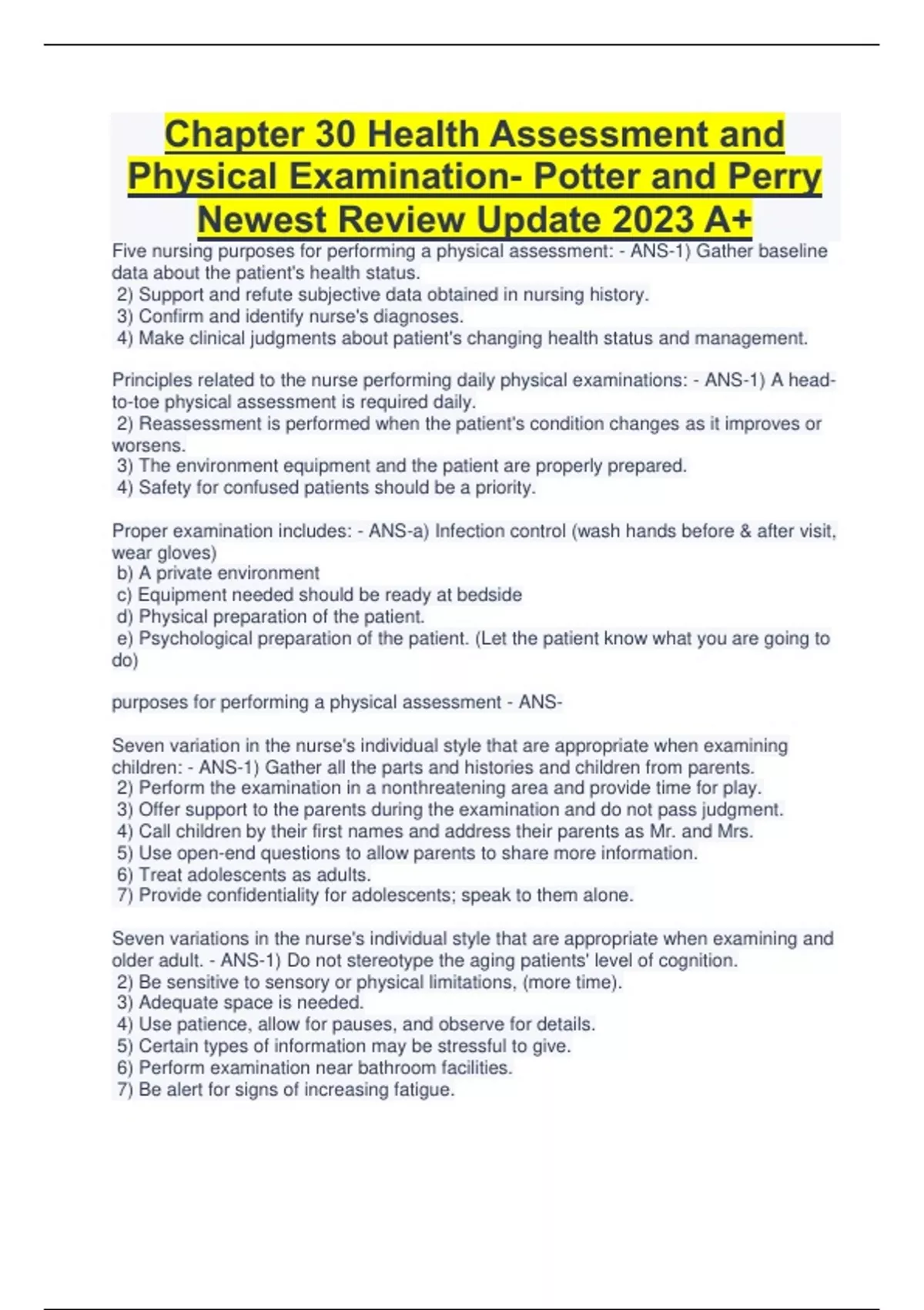 Chapter 30 Health Assessment and Physical Examination- Potter and Perry Newest Review Update 2023 A+ Five nursing purposes for performing a physical assessment: - ANS-1) Gather baseline data about the patient's health status. 2) Support and refute subjective data obtained in nursing history. 3) Confirm and identify nurse's diagnoses. 4) Make clinical judgments about patient's changing health status and management. Principles related to the nurse performing daily physical examinations: - ANS-1) A headto-toe physical assessment is required daily. 2) Reassessment is performed when the patient's condition changes as it improves or worsens. 3) The environment equipment and the patient are properly prepared. 4) Safety for confused patients should be a priority. Proper examination includes: - ANS-a) Infection control (wash hands before & after visit, wear gloves) b) A private environment c) Equipment needed should be ready at bedside d) Physical preparation of the patient. e) Psychological preparation of the patient. (Let the patient know what you are going to do) purposes for performing a physical assessment - ANSSeven variation in the nurse's individual style that are appropriate when examining children: - ANS-1) Gather all the parts and histories and children from parents. 2) Perform the examination in a nonthreatening area and provide time for play. 3) Offer support to the parents during the examination and do not pass judgment. 4) Call children by their first names and address their parents as Mr. and Mrs. 5) Use open-end questions to allow parents to share more information. 6) Treat adolescents as adults. 7) Provide confidentiality for adolescents; speak to them alone. Seven variations in the nurse's individual style that are appropriate when examining and older adult. - ANS-1) Do not stereotype the aging patients' level of cognition. 2) Be sensitive to sensory or physical limitations, (more time). 3) Adequate space is needed. 4) Use patience, allow for pauses, and observe for details. 5) Certain types of information may be stressful to give. 6) Perform examination near bathroom facilities. 7) Be alert for signs of increasing fatigue. Principles to follow to keep an examination well organized: - ANS-1) Compare both sides for symmetry 2) If the patient is ill, first assess the systems of the body part that is most at risk. 3) Offer rest periods if the patient becomes fatigued. 4) Record assessments in specific terms in the record. 5) Use common and accepted medical terms and abbreviations. 6) Record quick notes during examination to avoid delays. Inspection: - ANS-Is looking, listening and smelling to distinguish normal form abnormal findings. Guidelines to achieve the best results during inspection: - ANS-a) Adequate lighting is available. b) Use a direct light source. c) Inspect each area for size, shape, and color. d) Position and expose body parts as needed, maintaining privacy. e) Validate findings with the patient. Palpation: - ANS-Involves using hands to touch body parts. light palpation - ANS-involves pressing inward 1 cm (superficial) Deep palpation - ANS-involves depressing the area 4 cm to assess the condition of organs. Auscultation - ANS-is listening to the internal sounds the body makes. Auscultation described as - ANS-a) Frequency indicates the number of sound waves cycles generated per second by a vibrating object. b) Amplitude describes the loudness, soft to loud. c) Quality describes sound of similar frequency and loudness. d) Duration describes length of time that sound vibrations last. Observations of the patient's general appearance and behavior that should be viewed - ANS-a) Gender b) Age c) Signs of distress d) Body type e) Posture f) Gait g) Body Movements h) Hygiene and grooming i) Dress j) Body odor k) Affect and mood Continues...