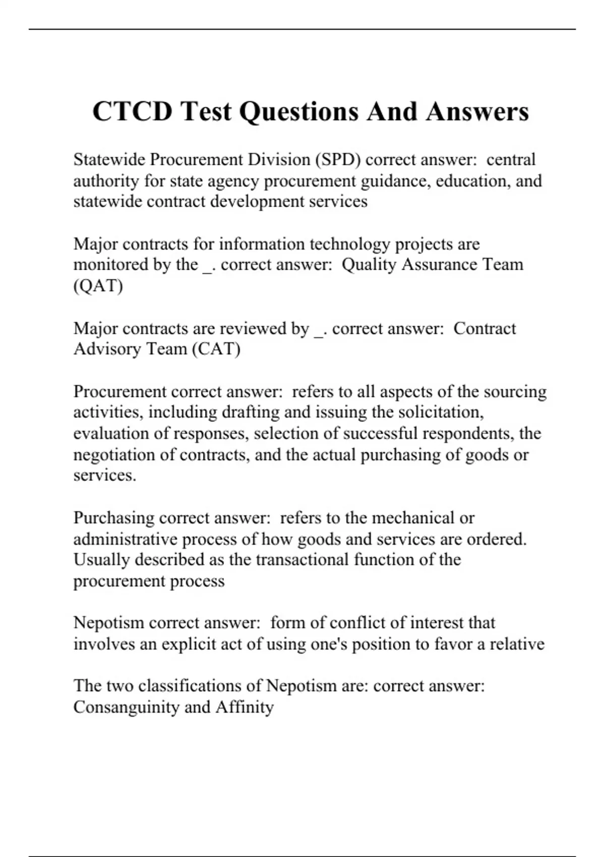 Statewide Procurement Division (SPD) correct answer: central authority for state agency procurement guidance, education, and statewide contract development services Major contracts for information technology projects are monitored by the _. correct answer: Quality Assurance Team (QAT) Major contracts are reviewed by _. correct answer: Contract Advisory Team (CAT) Procurement correct answer: refers to all aspects of the sourcing activities, including drafting and issuing the solicitation, evaluation of responses, selection of successful respondents, the negotiation of contracts, and the actual purchasing of goods or services. Purchasing correct answer: refers to the mechanical or administrative process of how goods and services are ordered. Usually described as the transactional function of the procurement process Nepotism correct answer: form of conflict of interest that involves an explicit act of using one's position to favor a relative The two classifications of Nepotism are: correct answer: Consanguinity and Affinity What is a consanguinity relationship? correct answer: one established through bloodlines includes individuals related by blood to the official or employee three degrees 1st: Parents, Children 2nd: Grandparents, Grandchildren, Brothers and Sisters 3rd: Great-Grandparents, Great-grandchildren, Nephews and Nieces, Uncles and Aunts What is a affinity relationship? correct answer: arises by virtue of marriage includes an officials or employee's spouse and individuals related to the spouse two degrees 1st: spouse, spouse's parents, Children's Spouses, Spouse's children 2nd: Spouse's grandparents, spouses grandchildren, spouse's brothers and sisters, brothers and sister's spouses Bribery correct answer: if a person intentionally or knowingly offers, confers, or agrees to confer on another, or solicits, accepts, or agrees to accept any benefit as consideration for a violation of public servants legal duty or a public servants decision, opinion, recommendation, vote, or any other exercise of discretion.