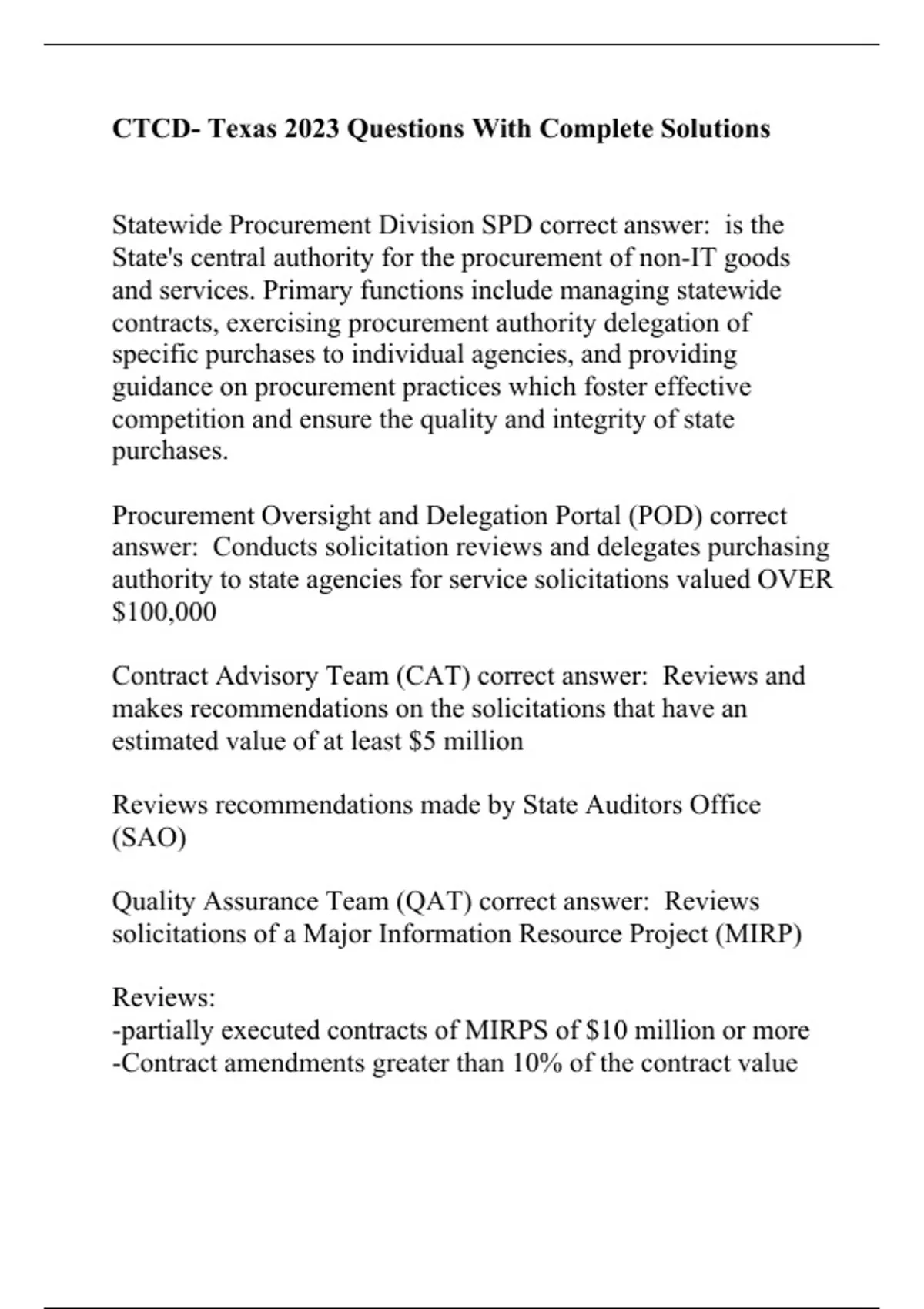 Statewide Procurement Division SPD correct answer: is the State's central authority for the procurement of non-IT goods and services. Primary functions include managing statewide contracts, exercising procurement authority delegation of specific purchases to individual agencies, and providing guidance on procurement practices which foster effective competition and ensure the quality and integrity of state purchases. Procurement Oversight and Delegation Portal (POD) correct answer: Conducts solicitation reviews and delegates purchasing authority to state agencies for service solicitations valued OVER $100,000 Contract Advisory Team (CAT) correct answer: Reviews and makes recommendations on the solicitations that have an estimated value of at least $5 million Reviews recommendations made by State Auditors Office (SAO) Quality Assurance Team (QAT) correct answer: Reviews solicitations of a Major Information Resource Project (MIRP) Reviews: -partially executed contracts of MIRPS of $10 million or more -Contract amendments greater than 10% of the contract value Major Information Resource Project (MIRP) correct answer: Identified as such by legislature OR Project valued at $5 million or more, -one year + to reach operational status, -involves more than one state agency, -significantly impacts work processes of agency (Ex. CAPPS FIN) Statewide Contract Development Team correct answer: Develop Term, Managed, & TXMAS contracts Processes open market req's (OMR) for contracts for goods valued over $50K. Statewide Contract Management Team correct a