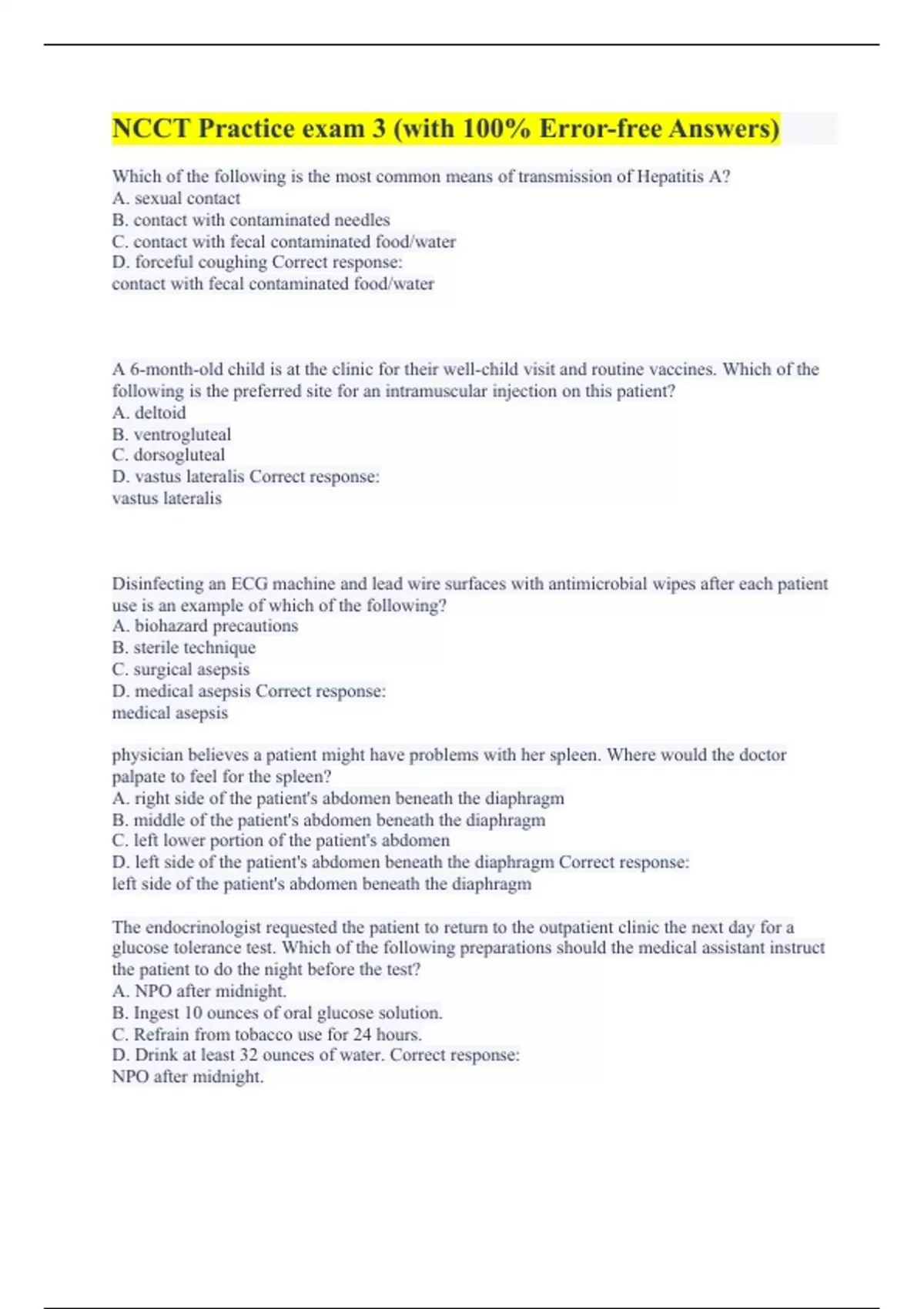 Which of the following is the most common means of transmission of Hepatitis A? A. sexual contact B. contact with contaminated needles C. contact with fecal contaminated food/water D. forceful coughing Correct response: contact with fecal contaminated food/water A 6-month-old child is at the clinic for their well-child visit and routine vaccines. Which of the following is the preferred site for an intramuscular injection on this patient? A. deltoid B. ventrogluteal C. dorsogluteal D. vastus lateralis Correct response: vastus lateralis Disinfecting an ECG machine and lead wire surfaces with antimicrobial wipes after each patient use is an example of which of the following? A. biohazard precautions B. sterile technique C. surgical asepsis D. medical asepsis Correct response: medical asepsis physician believes a patient might have problems with her spleen. Where would the doctor palpate to feel for the spleen? A. right side of the patient's abdomen beneath the diaphragm B. middle of the patient's abdomen beneath the diaphragm C. left lower portion of the patient's abdomen D. left side of the patient's abdomen beneath the diaphragm Correct response: left side of the patient's abdomen beneath the diaphragm The endocrinologist requested the patient to return to the outpatient clinic the next day for a glucose tolerance test. Which of the following preparations should the medical assistant instruct the patient to do the night before the test? A. NPO after midnight. B. Ingest 10 ounces of oral glucose solution. C. Refrain from tobacco use for 24 hours. D. Drink at least 32 ounces of water. Correct response: NPO after midnight.