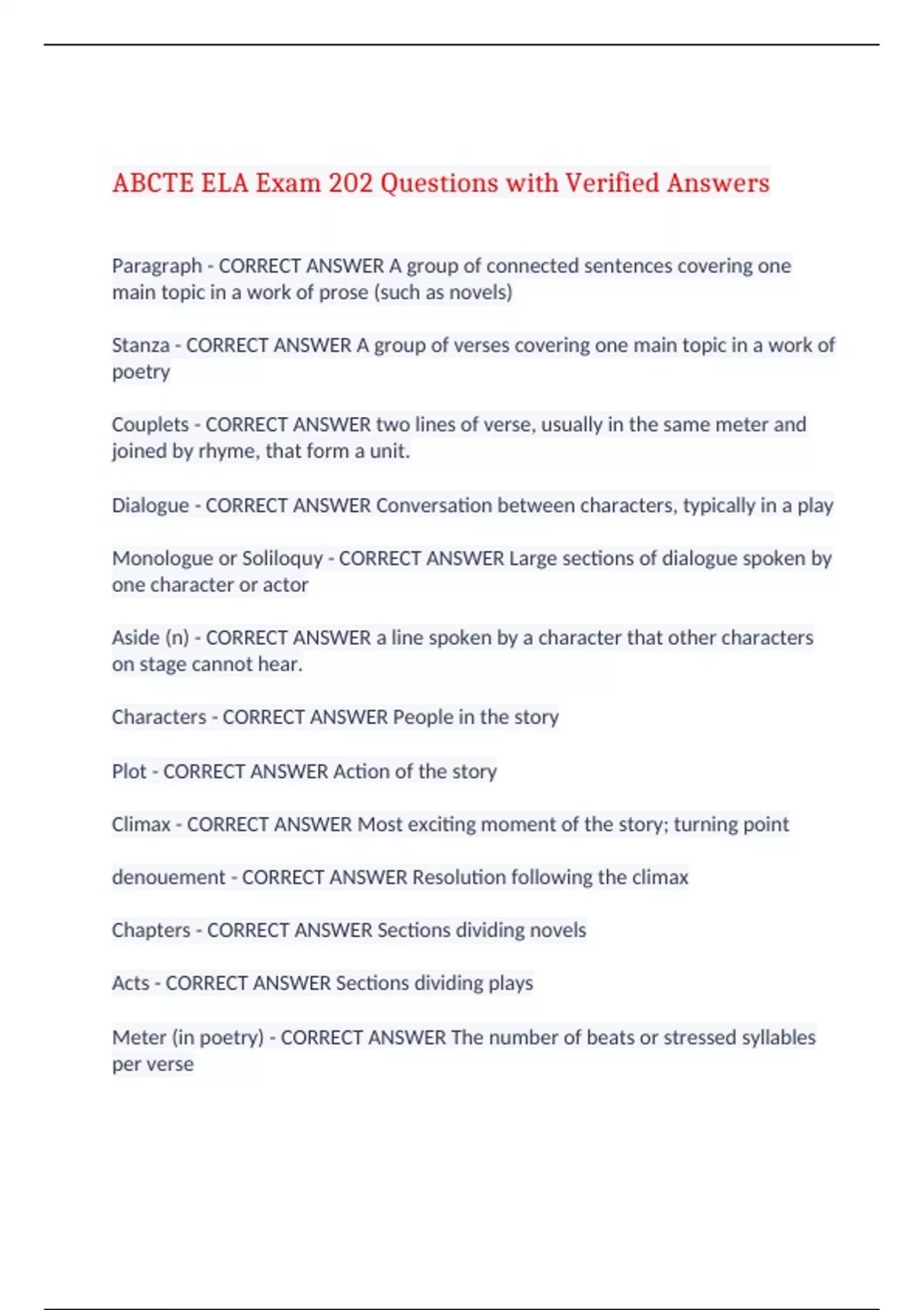 ABCTE ELA Exam 202 Questions with Verified Answers Paragraph - CORRECT ANSWER A group of connected sentences covering one main topic in a work of prose (such as novels) Stanza - CORRECT ANSWER A group of verses covering one main topic in a work of poetry Couplets - CORRECT ANSWER two lines of verse, usually in the same meter and joined by rhyme, that form a unit. Dialogue - CORRECT ANSWER Conversation between characters, typically in a play Monologue or Soliloquy - CORRECT ANSWER Large sections of dialogue spoken by one character or actor Aside (n) - CORRECT ANSWER a line spoken by a character that other characters on stage cannot hear. Characters - CORRECT ANSWER People in the story Plot - CORRECT ANSWER Action of the story Climax - CORRECT ANSWER Most exciting moment of the story; turning point denouement - CORRECT ANSWER Resolution following the climax Chapters - CORRECT ANSWER Sections dividing novels Acts - CORRECT ANSWER Sections dividing plays Meter (in poetry) - CORRECT ANSWER The number of beats or stressed syllables per verse Dimeter (n) - CORRECT ANSWER 2 beats or stressed syllables per verse Trimeter - CORRECT ANSWER 3 beats or stressed syllables per verse Tetrameter - CORRECT ANSWER 4 beats or stressed syllables per verse Pentameter - CORRECT ANSWER 5 beats or stressed syllables per verse iambic meter/foot - CORRECT ANSWER unstressed syllable followed by a stressed syllable spondaic foot - CORRECT ANSWER two stressed syllables dactylic foot - CORRECT ANSWER /uu anapestic foot - CORRECT ANSWER uu/ trochaic foot - CORRECT ANSWER a stressed syllable followed by an unstressed syllable Rhyme Schemes - CORRECT ANSWER the pattern of rhymes in a poem (ABAB, ABCA, etc.) free verse - CORRECT ANSWER poetry that does not rhyme or have a regular meter blank verse - CORRECT ANSWER unrhymed iambic pentameter epic poems - CORRECT ANSWER a long poem that tells the deeds of a great hero Epistolary Poems - CORRECT ANSWER Poems that are written & read as letters Ballad - CORRECT ANSWER a type of poem that is meant to be sung and is both lyric and narrative in nature; often subjects are love, death & religious topics Elegies - CORRECT ANSWER Poems of loss that include lament, praise of the deceased & solace for loss Odes - CORRECT ANSWER Poems that express strong emotions about life pastoral poetry - CORRECT ANSWER poetry that depicts rustic life in idealized terms epigram - CORRECT ANSWER memorable, one-or-two line rhymes Limericks - CORRECT ANSWER humorous 5-line poems with a specific rhythm pattern and rhyme scheme (2 lines of iambic dimeter, 2 lines of iambic dimeter, followed by 1 of iambic trimeter) Haiku - CORRECT ANSWER A japanese form of poetry, consisting of three unrhymed lines of five, seven, and five syllables Sonnet - CORRECT ANSWER 14 lines of iambic pentameter Petrarchan sonnet - CORRECT ANSWER poem that has one rhyming octave (8 lines) and one rhyming sestet (6 lines) English Sonnet (Shakespearean) - CORRECT ANSWER Rhyme scheme is less flexible (3 quatrains & a couplet or "abab cdcd efef gg" What is the most common meter in poetry? - CORRECT ANSWER Iambic pentameter Who is the "Father of English Literature"? - CORRECT ANSWER Geoffrey Chaucer The Canterbury Tales - CORRECT ANSWER Geoffrey Chaucer; represents a cross-section of society in the Middle Ages as they make a religious pilgrimage to the shrine of St. Thomas a Beckett Frame-Tale - CORRECT ANSWER A secondary story or stories embedded in the main story metaphysical poetry - CORRECT ANSWER exploration of complex ideas through extended metaphors and paradox Metaphysical Poets - CORRECT ANSWER John Donne, Andrew Marvell, George Herbert Romanticism - CORRECT ANSWER Identified with & gained momentum from the French Revolution; reaction against the political & social standards of aristocracy & its overthrowing of them; freedom of expression & power of individual imagination Romantic Authors - CORRECT ANSWER John Keats, Percy Bysshe Shelly, Lord Byron, Edgar Allan Poe, Nathaniel Hawthorne, William Wordsworth, Samuel Taylor Coleridge William Blake - CORRECT ANSWER Songs of Innocence and Experience William Wordsworth - CORRECT ANSWER () Romantic poet, used one of the most important aspects of Romanticism: love of nature. used "real language of men" Samuel Taylor Coleridge - CORRECT ANSWER The Rime of the Ancient Mariner, Kubla Khan George Gordon, Lord Byron - CORRECT ANSWER Don Juan, Childe Harold's Pilgrimage Percy Bysshe Shelley - CORRECT ANSWER wrote "Prometheus Unbound," "Ode to the West Wind," and "To A Skylark" John Keats - CORRECT ANSWER Ode on a Grecian Urn, ode on Indolence, ode on Melancholy carpe diem poetry - CORRECT ANSWER poetry that emphasizes the shortness of life and the need to act in or enjoy the present Example of Carpe Diem Poetry - CORRECT ANSWER Andrew Marvell: To his Coy Mistress; Robert Herrick: To the virgins, to make much of time picaresque novel - CORRECT ANSWER An episodic novel about a roguelike wanderer who lives off his wits. Ex: Don Quixote, Moll Flanders Gothic novel - CORRECT ANSWER A novel in which supernatural horrors and an atmosphere of unknown terrors pervades the action; Mary Shelley's Frankenstein, Horace Walpole's Castle of Otranto; Edgar Allen Poe; Anne Rice Psychological Novels - CORRECT ANSWER Explore characters' motivations; George Eliot, Fyodor Dostoyevsky's Crime & Punishment, Tolstoy's Anna Karenina, Gustave Flaubert's Nadame Bovary Novel of Manners - CORRECT ANSWER A novel focusing on and describing the social customs and habits of a particular social group; Jane Austen epistolary novel - CORRECT ANSWER A novel that tells its story through letters written from one character to another. Western World Sentimental Novels - CORRECT ANSWER Depict emotional rather than only physical love; Samuel Richardson's Pamela, Pastoral Novels - CORRECT ANSWER Idealize country life as idyllic & utopian Bildungsroman - CORRECT ANSWER A coming of age story, including youth's struggles & searches for th