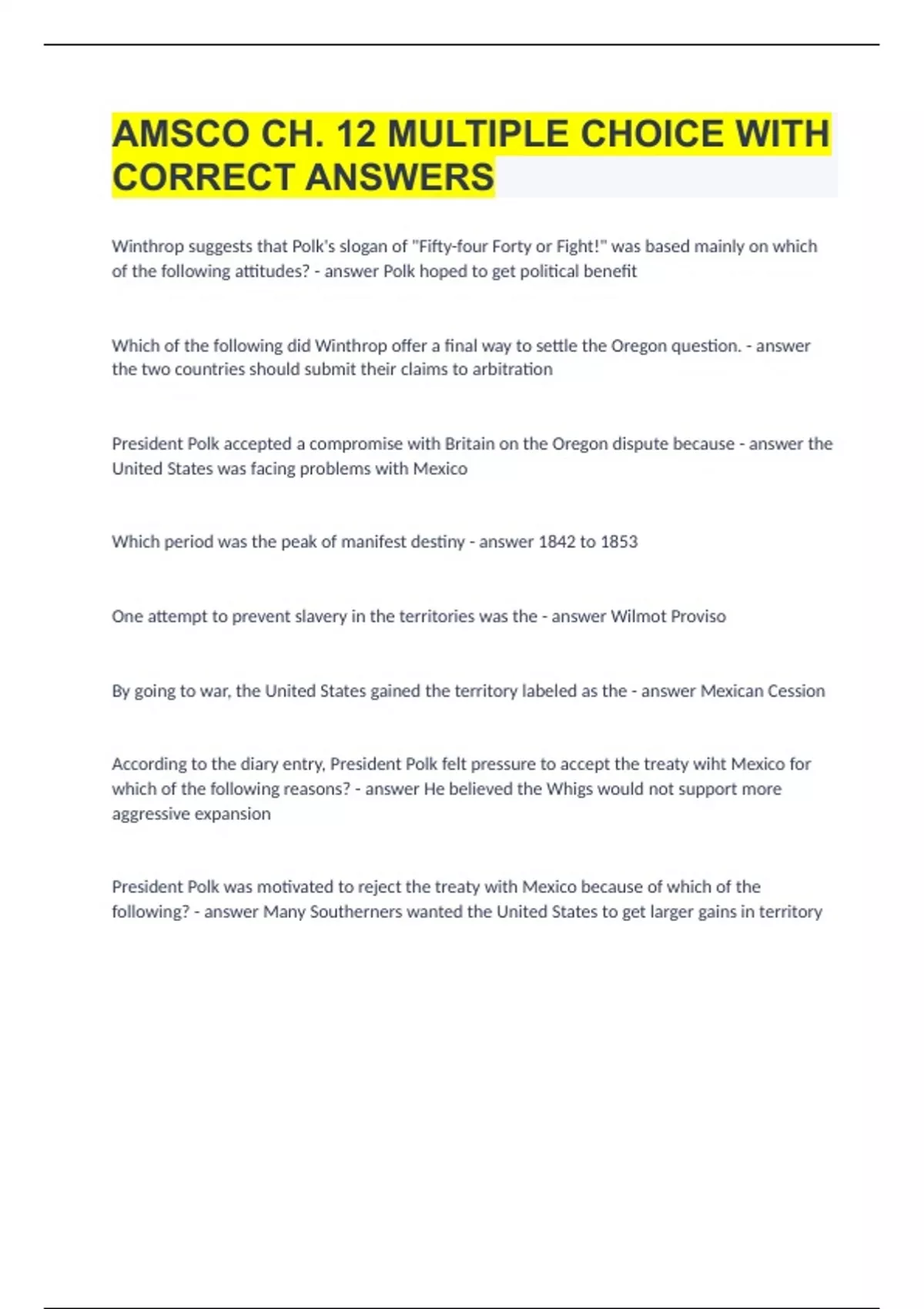 AMSCO CH. 12 MULTIPLE CHOICE WITH CORRECT ANSWERS