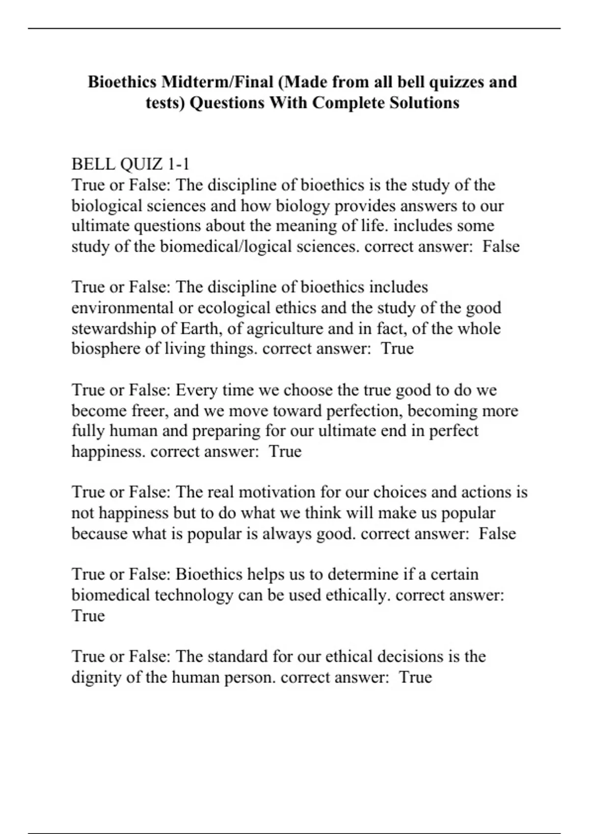 Bioethics Midterm/Final (Made from all bell quizzes and tests) Questions With Complete Solutions