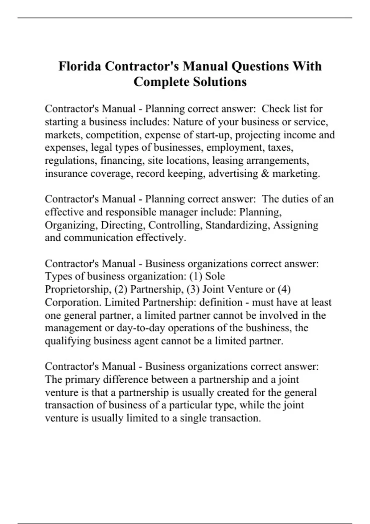 Florida Contractor's Manual Questions With Complete Solutions