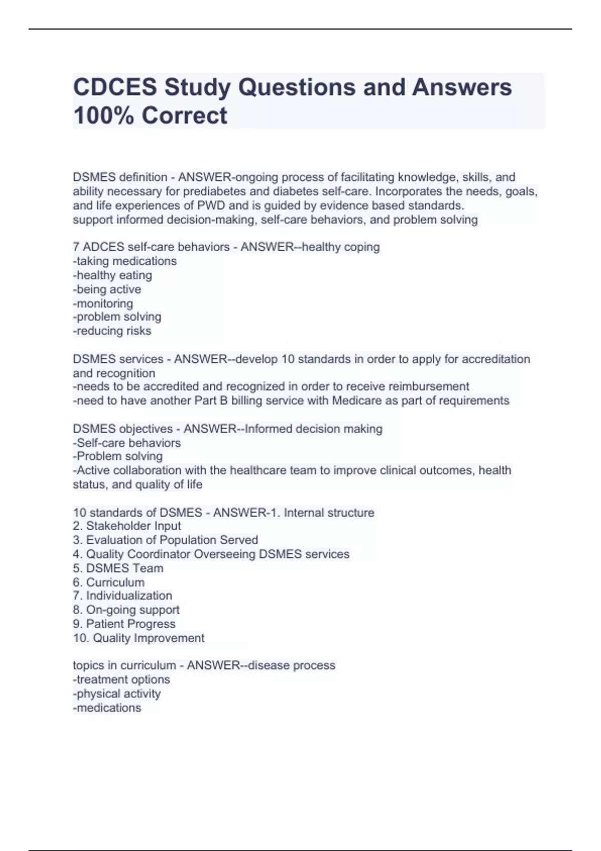 CDCES Study Questions and Answers 100% CorrectCDCES Study Questions and Answers 100% CorrectCDCES Study Questions and Answers 100% Correct DSMES definition - ANSWER-ongoing process of facilitating knowledge, skills, and ability necessary for prediabetes and diabetes self-care. Incorporates the needs, goals, and life experiences of PWD and is guided by evidence based standards. support informed decision-making, self-care behaviors, and problem solving 7 ADCES self-care behaviors - ANSWER--healthy coping -taking medications -healthy eating -being active -monitoring -problem solving -reducing risks DSMES services - ANSWER--develop 10 standards in order to apply for accreditation and recognition -needs to be accredited and recognized in order to receive reimbursement -need to have another Part B billing service with Medicare as part of requirements DSMES objectives - ANSWER--Informed decision making -Self-care behaviors -Problem solving -Active collaboration with the healthcare team to improve clinical outcomes, health status, and quality of life 10 standards of DSMES - ANSWER-1. Internal structure 2. Stakeholder Input 3. Evaluation of Population Served 4. Quality Coordinator Overseeing DSMES services 5. DSMES Team 6. Curriculum 7. Individualization 8. On-going support 9. Patient Progress 10. Quality Improvement topics in curriculum - ANSWER--disease process -treatment options -physical activity -medications