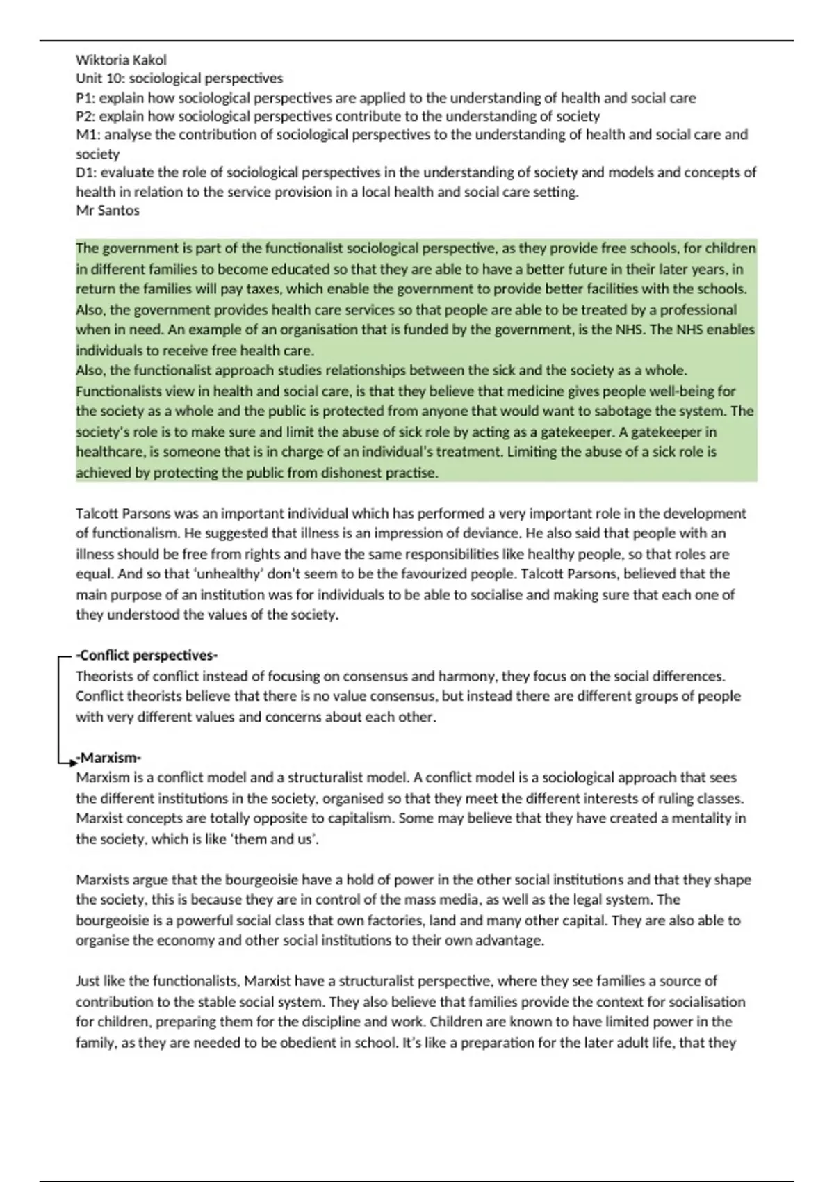 P1: explain how sociological perspectives are applied to the understanding of health and social care