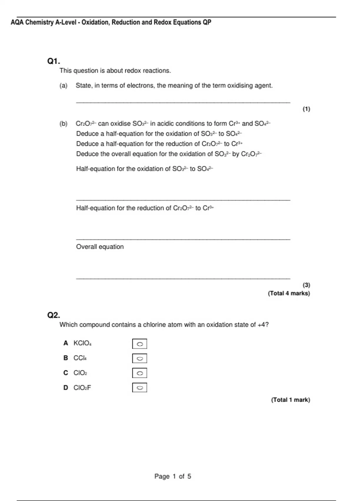 , AQA Chemistry A-Level - Oxidation, Reduction and Redox Equations QP