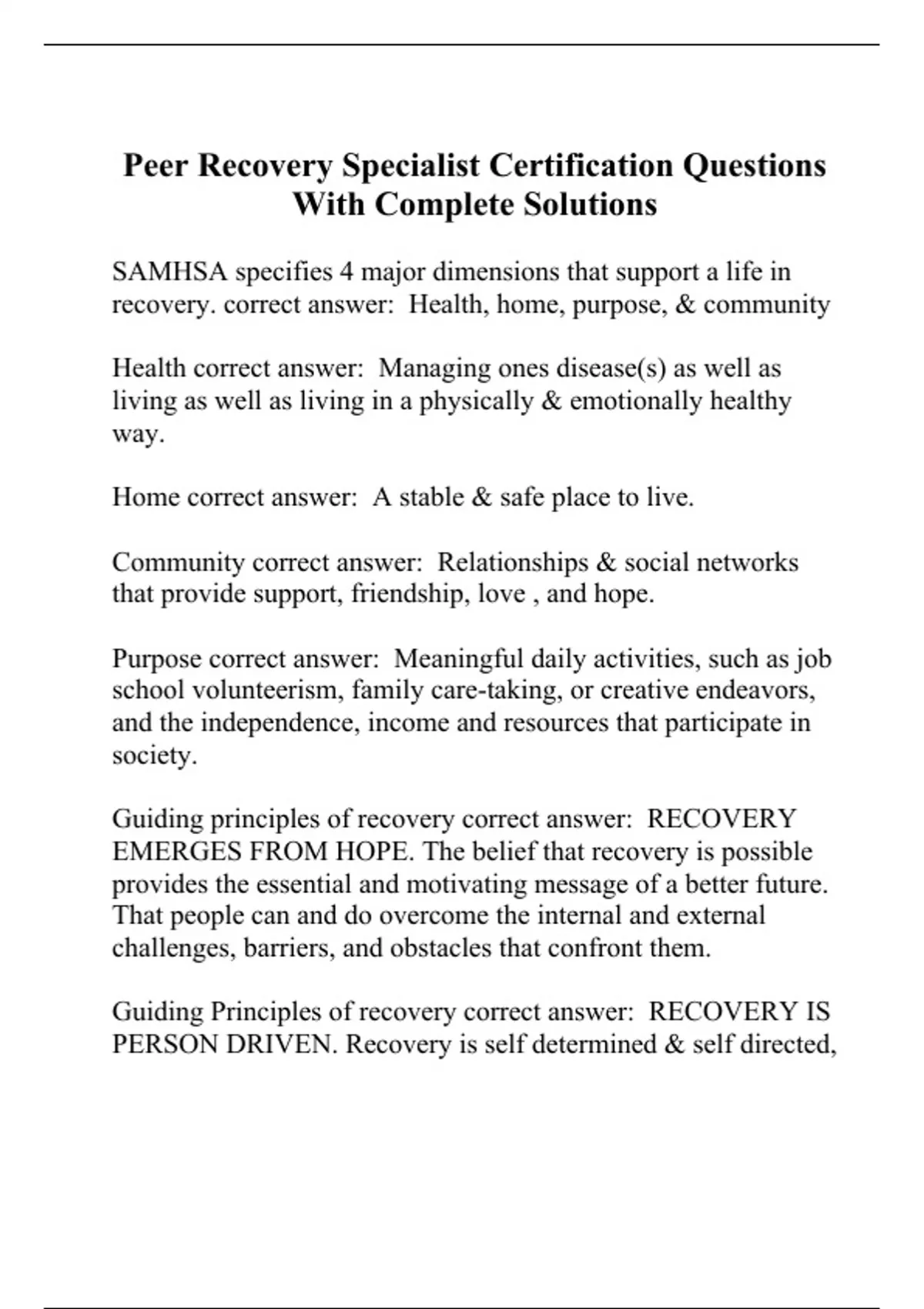 Peer Recovery Specialist Certification Questions With Complete Solutions