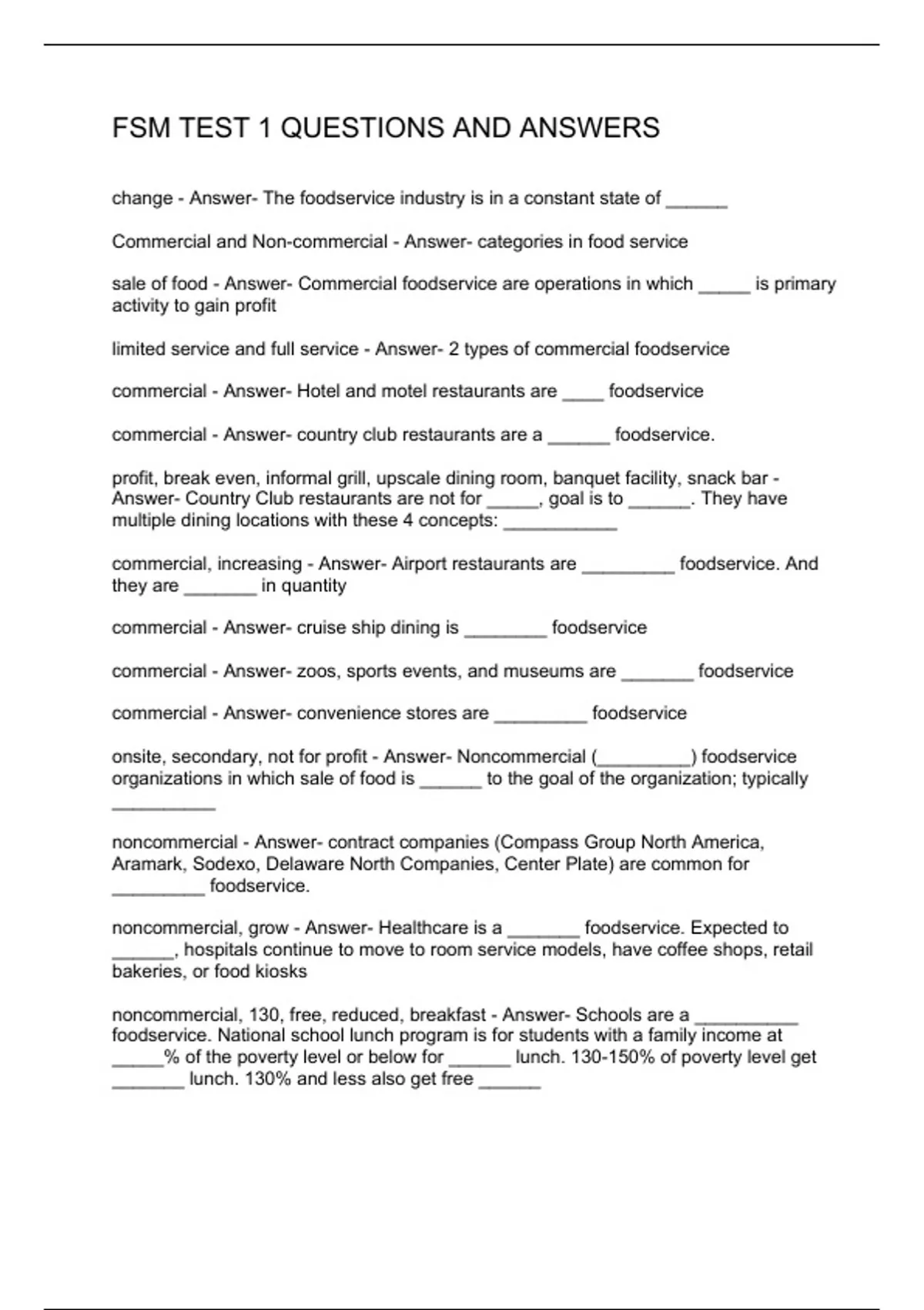 change - Answer- The foodservice industry is in a constant state of ______ Commercial and Non-commercial - Answer- categories in food service sale of food - Answer- Commercial foodservice are operations in which _____ is primary activity to gain profit limited service and full service - Answer- 2 types of commercial foodservice commercial - Answer- Hotel and motel restaurants are ____ foodservice commercial - Answer- country club restaurants are a ______ foodservice. profit, break even, informal grill, upscale dining room, banquet facility, snack bar - Answer- Country Club restaurants are not for _____, goal is to ______. They have multiple dining locations with these 4 concepts: ___________ commercial, increasing - Answer- Airport restaurants are _________ foodservice. And they are _______ in quantity commercial - Answer- cruise ship dining is ________ foodservice commercial - Answer- zoos, sports events, and museums are _______ foodservice commercial - Answer- convenience stores are _________ foodservice onsite, secondary, not for profit - Answer- Noncommercial (_________) foodservice organizations in which sale of food is ______ to the goal of the organization; typically __________ noncommercial - Answer- contract companies (Compass Group North America, Aramark, Sodexo, Delaware North Companies, Center Plate) are common for _________