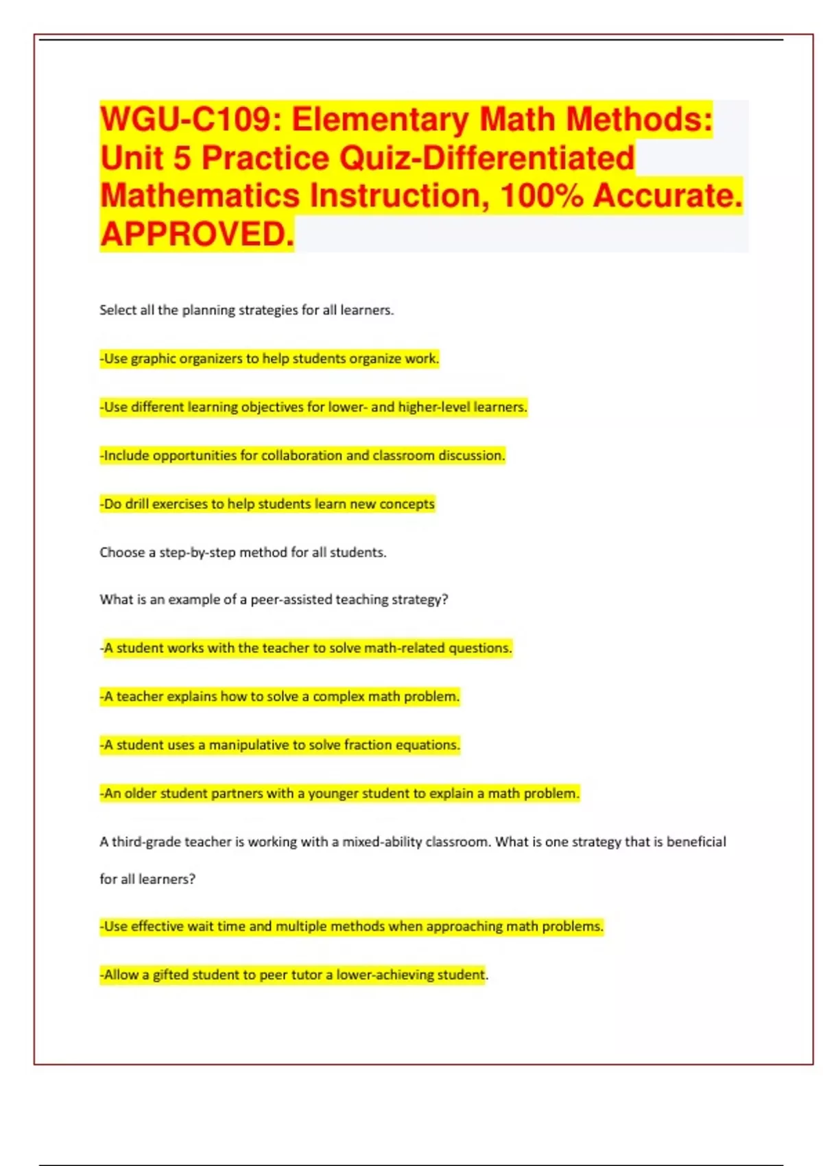 WGU-C109: Elementary Math Methods: Unit 5 Practice Quiz-Differentiated Mathematics Instruction, 100% Accurate. APPROVED 2024