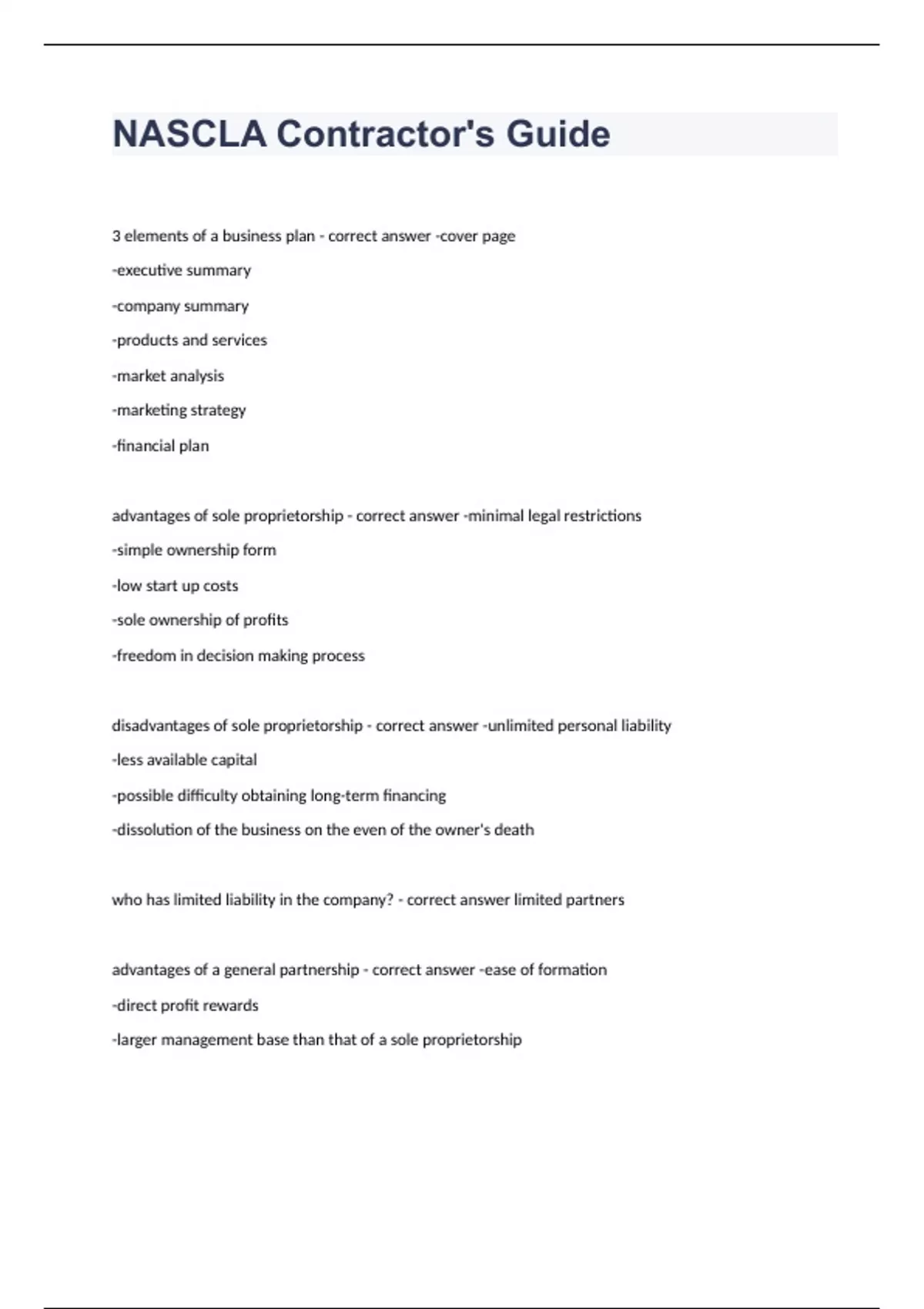 NASCLA Contractor's Guide3 elements of a business plan - correct answer -cover page -executive summary -company summary -products and services -market analysis -marketing strategy -financial plan advantages of sole proprietorship - correct answer -minimal legal restrictions -simple ownership form -low start up costs -sole ownership of profits -freedom in decision making process disadvantages of sole proprietorship - correct answer -unlimited personal liability -less available capital -possible difficulty obtaining long-term financing -dissolution of the business on the even of the owner's death who has limited liability in the company? - correct answer limited partners advantages of a general partnership - correct answer -ease of formation -direct profit rewards -larger management base than that of a sole proprietorship disadvantages of a general partnership - correct answer -unlimited personal liability of general partners -multiple decision makers -limited life of the business -changes of partners or partnership agreement may be difficult -partnership dissolves in the event of the death of a general partner when is a contractor's license needed? - correct answer when the job is over $30,000 bid documents - correct answer -invitation to bid -bid instructions -bid forms -supplements what is an invitation to bid - correct answer gives a brief overview of the project, deadlines, and general requirements bid instructions - correct answer contain specifics of how the bis should be completed and submitted bid forms - correct answer bid sheet bid schedule bidder's questionnaire on the experience financial responsibility and capability copy of the contract supplements - correct answer includes all items important to the overall bid process such as property and soil analysis what is the estimating checklist helpful for? - correct answer when setting up your estimating framework to make sure that you have accounted for all materials and labor